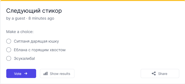 Те кому противны стикеры можете не открывать, акция единоразовая ради лулзов по просьбе хейтерка Выбираем идею для некст стикера в общем опросеhttps://strawpoll.com/1MnwkzNVAn7!