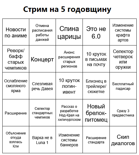 А в бинго должны быть только прям хотелки, фантастические варианты, или ожидаемое и почти гарантированное тоже?