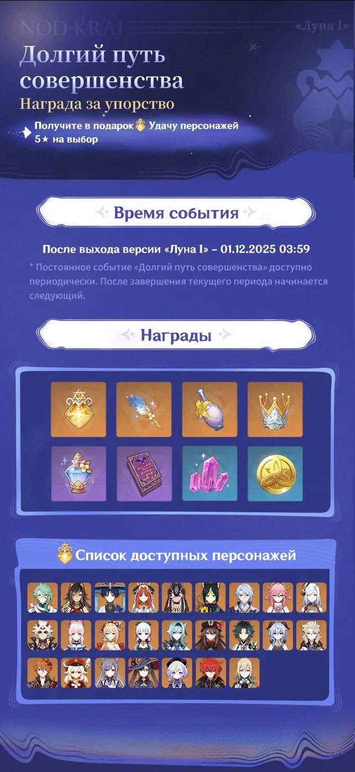 Сейчас самое важное, 4 бесплатные консты. Если нельзя забрать как нового перса, ну типа, если перса нет - проходишь эту херню и получаешь его. То это же полная хуета. Стандарту брать консты - это бред собачий, там один мусор. Теперь смотрим пул лимиток, старичкам может ещё ок, вы там выкрутили триста лет назад Эулу какую-нибудь, сейчас усилили её. Но вот я, у меня Натлановичков полная жопа, ещё пара старых персов типа Фурины, Дыни. Ну и что мы видим. В этом аттракционе невиданной щедрости один мусор, а кто не совсем мусор - баннера не имеет, т.е. я их даже получить не смогу. Дыни нет, Лису не забрать, Нахиды тоже нет, но и не стал бы забирать, но не важно. Т.е. это даже не абстрактная теория, я буквальный пример, который не может забрать НИЧЕГО из этой херни. Они не могли из ХСРа скопировать?! Просто дайте на выбор забрать перса и всё.