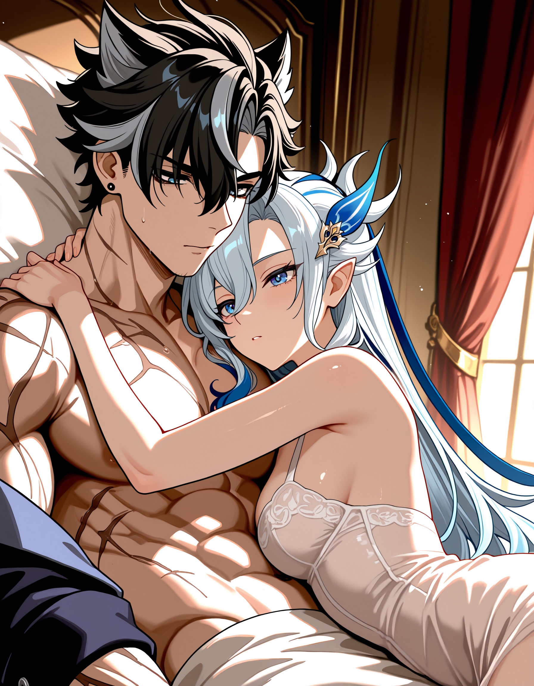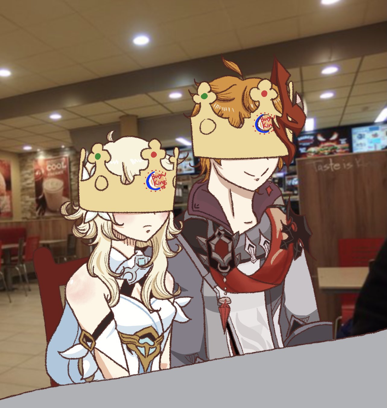 Напоминаю, что арт к годовщине посвящен свадьбе Светки и Чмони. Свадебный торт на месте. Архонты похдравляют счастливую пару не из Тейвата букетами и подарками
