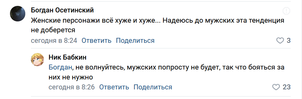 Зачем вообще девушки играют в ззз? Тут все буквально сделано на мужскую аудиторию. Хуевые продажи мужских персонажей это подтвердили. Не будет никто всерьез рассматривать часть аудитории, которая вместо денег приносит вынос мозга в комментарии, это не равноценно.