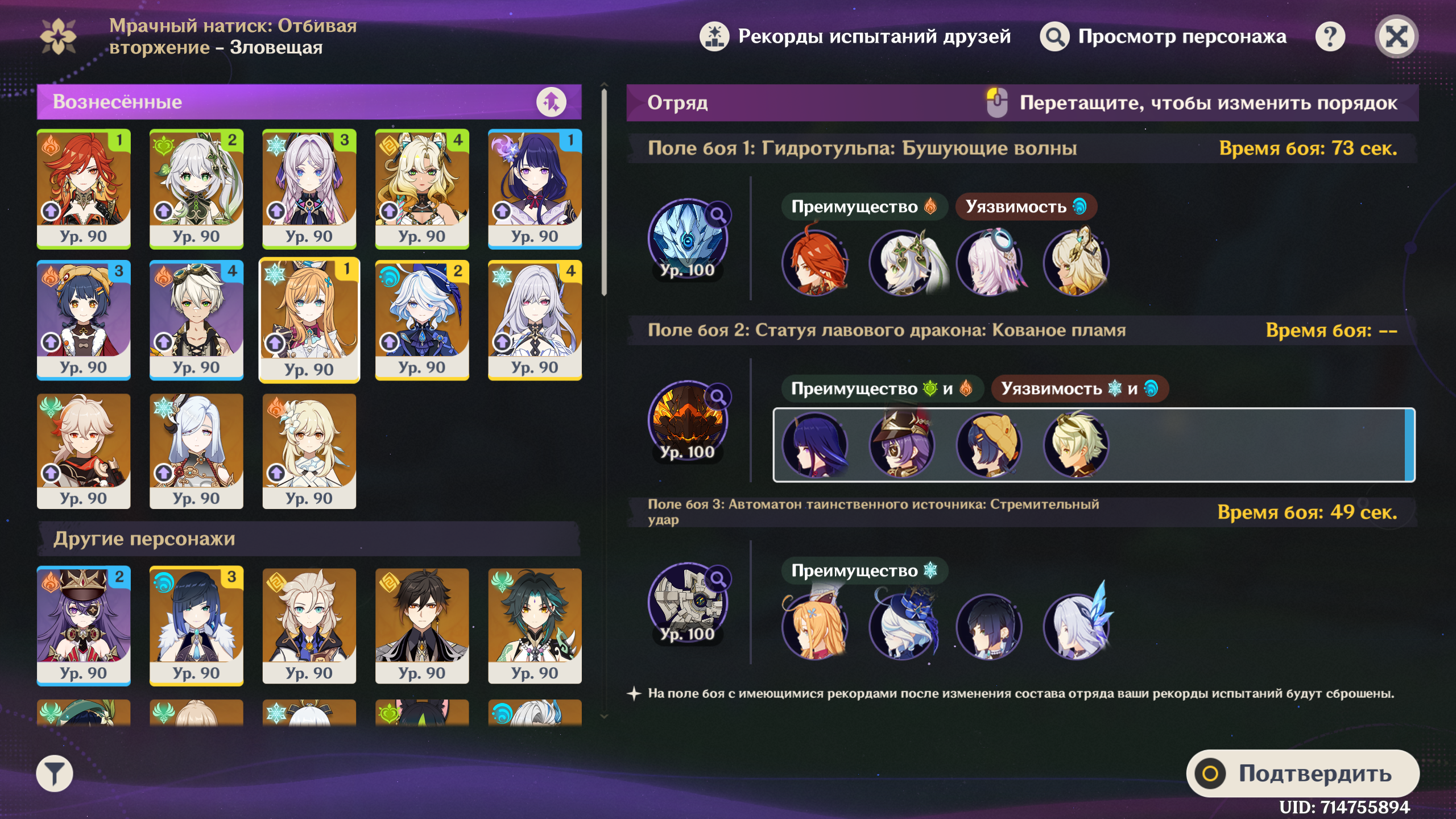 Превозмог 5 сложность, натурально превозмог, что твой ебучий протагонист шонена. Официально заявляю, что это дерьмо проходимо для труЪф2п зоопарководов. Никаких донатных пух, все пятёрки на с0 (кроме ПироГГ, если его в принципе можно считать пятёркой), у Арли вообще трёхзведная Белая кисть, лол. Все четвёрки, правда, с6 (кроме Шеври, у неё с4). Это того не стоило, не советую никому хоть чуть менее ебанутому над этим потеть. Лавовая статуя - пиздец мразотное дерьмо, надеюсь никогда её больше не увидеть в Натиске.