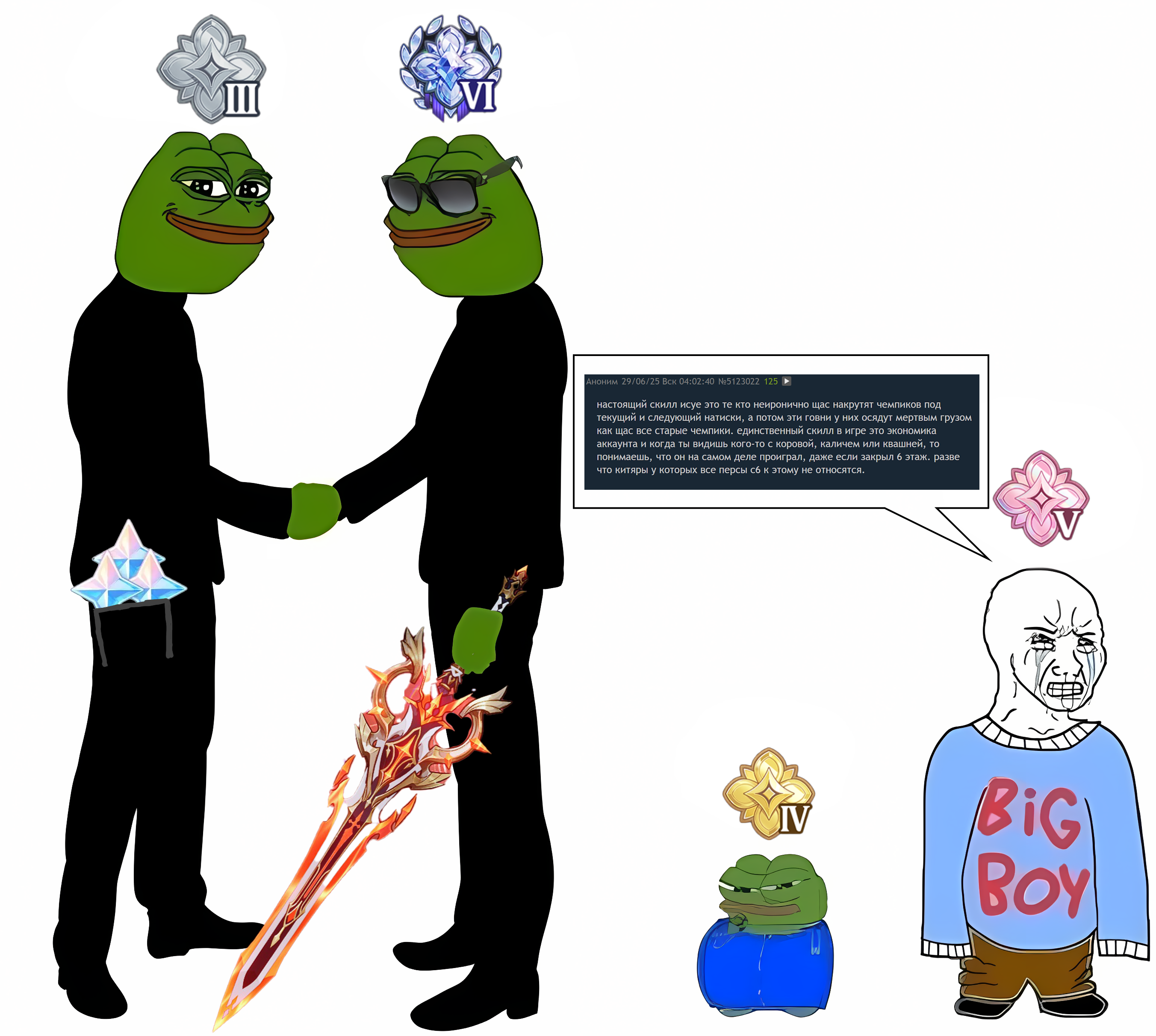 настоящий скилл исуе это те кто неиронично щас накрутят чемпиков под текущий и следующий натиски, а потом эти говни у них осядут мертвым грузом как щас все старые чемпики. единственный скилл в игре это экономика аккаунта и когда ты видишь кого-то с коровой, каличем или квашней, то понимаешь, что он на самом деле проиграл, даже если закрыл 6 этаж. разве что китяры у которых все персы с6 к этому не относятся.