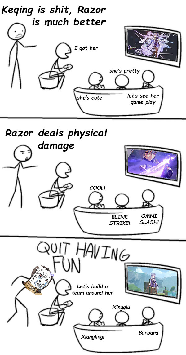 прожимать заряженные атаки в игре геншин импакт неудобно на миличемпиках которые спамят автухами. достану повариху и мб скурк норм станет, но без чертихи-поварихи дела совсем не те, разрывов нету, разве что моей жопы тока ну и скуфья нихрена не хилит так что фурину нахуй из пачки, лучше елань с синим воткнуть 3 секунды побить потом на поле и там уже ульты елани и синего закончатся. нету удобной пачки для чемпика, ничё не сделать.