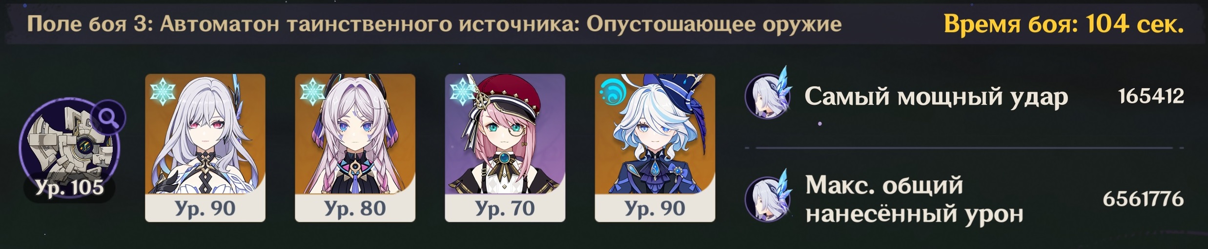 2 часа на робота потратил, 85% не могу пробить. Хуево без Скирк. По итогу, лучший таймер нахуй с Розарией. Розария/Фурина/Скуфания/Лайла. Больше невозможно выжать.