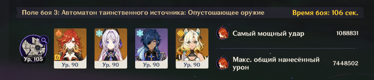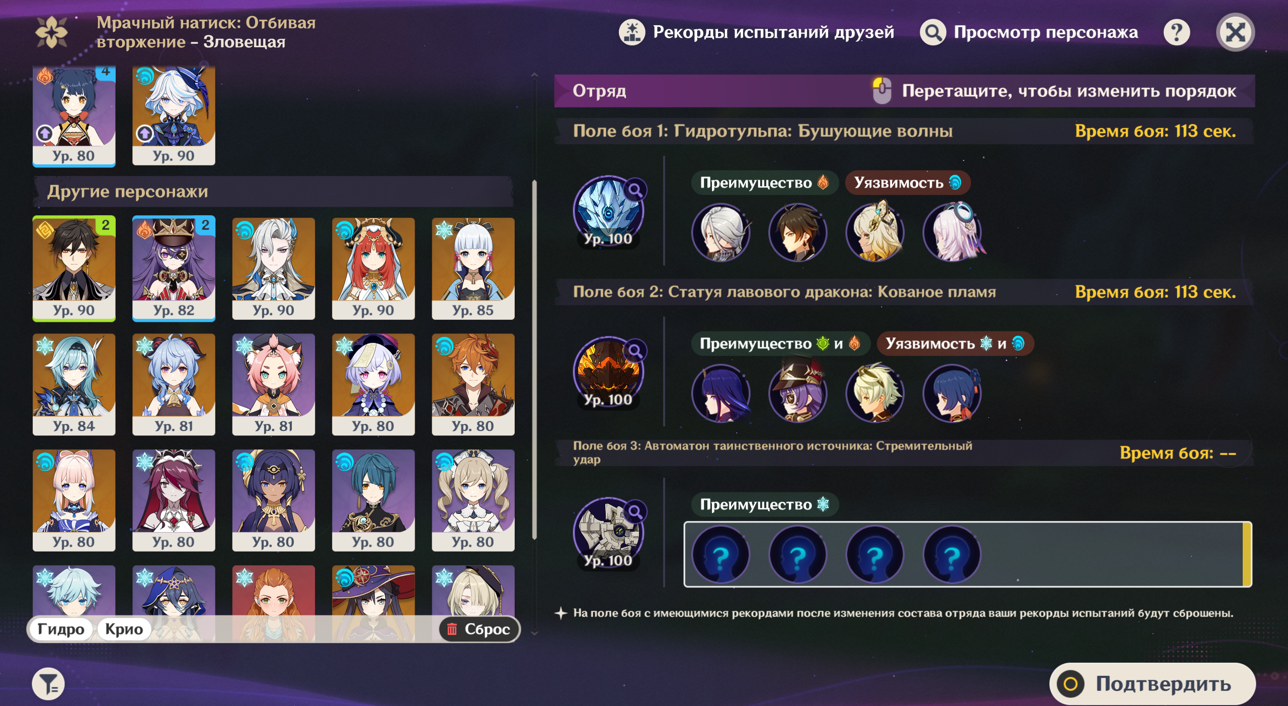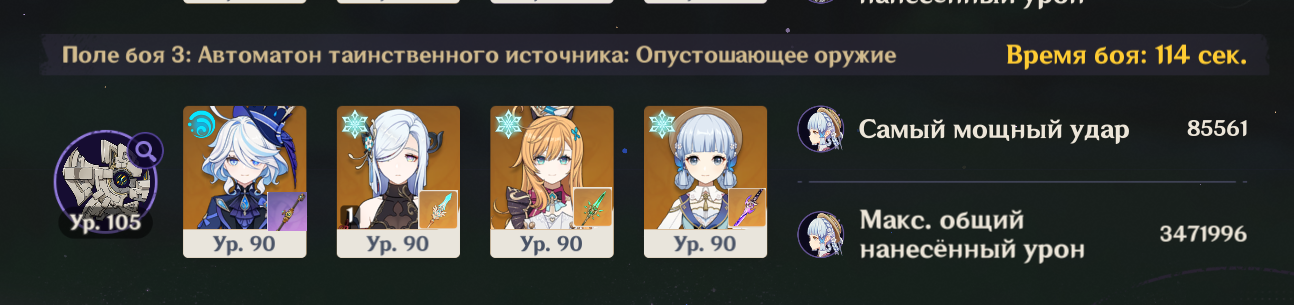 Охереть пчелы, я всё-таки закрыл пятую. Три дня ретраев... В итоге каждый стейдж закрыл какими-то абсурдными пачками, но по-другому никак. Как бы я не тасовал персов шансы были только в такой комбинации. В первой как долбаёб каждые 20 сек бегаешь Кэйей с церемоном тыкаешь минитульп. А ещё чтобы пробить щит надо обязательно затаймить двойной зактрут Сянки в двойной поляне Бениса. Сдавать холды Лини в поляне Бениса без щита против тульпы это вообще отдельное удавольствие. Одна ошибка и ты в могиле. Это наверное был самый потный стейдж для меня. Во второй С0 Акулка с казиком проходит только если оба раза подряд заролять ноту на аффикс. Немного брутфорса, а в целом этот стейдж не особо запарный. В принципе, прожаркой с Лини он тоже проходился. Пройти третий стейдж не имея Скирк, Скуфьи и Яяки в начале казалось вообще не возможным. Что я туда только не траил. В итоге пришел к форвард вейп Фуре из кармана. Шарлотта тут просто открытие, её e+q просто изничтожает криошкалу зарядки. Даже не качанная заовнила. В итоге, как и ожидалось, перо слил в никуда, но хотя бы победное ощущение закрытого контента осталось.