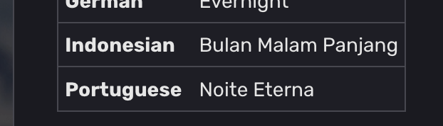 >>5349077 >Noite Eterna Португальцам настолько похуй, что они даже не стали подбирать какую-то свою идиому, а просто дословно перевели "Бесконечная ночь"