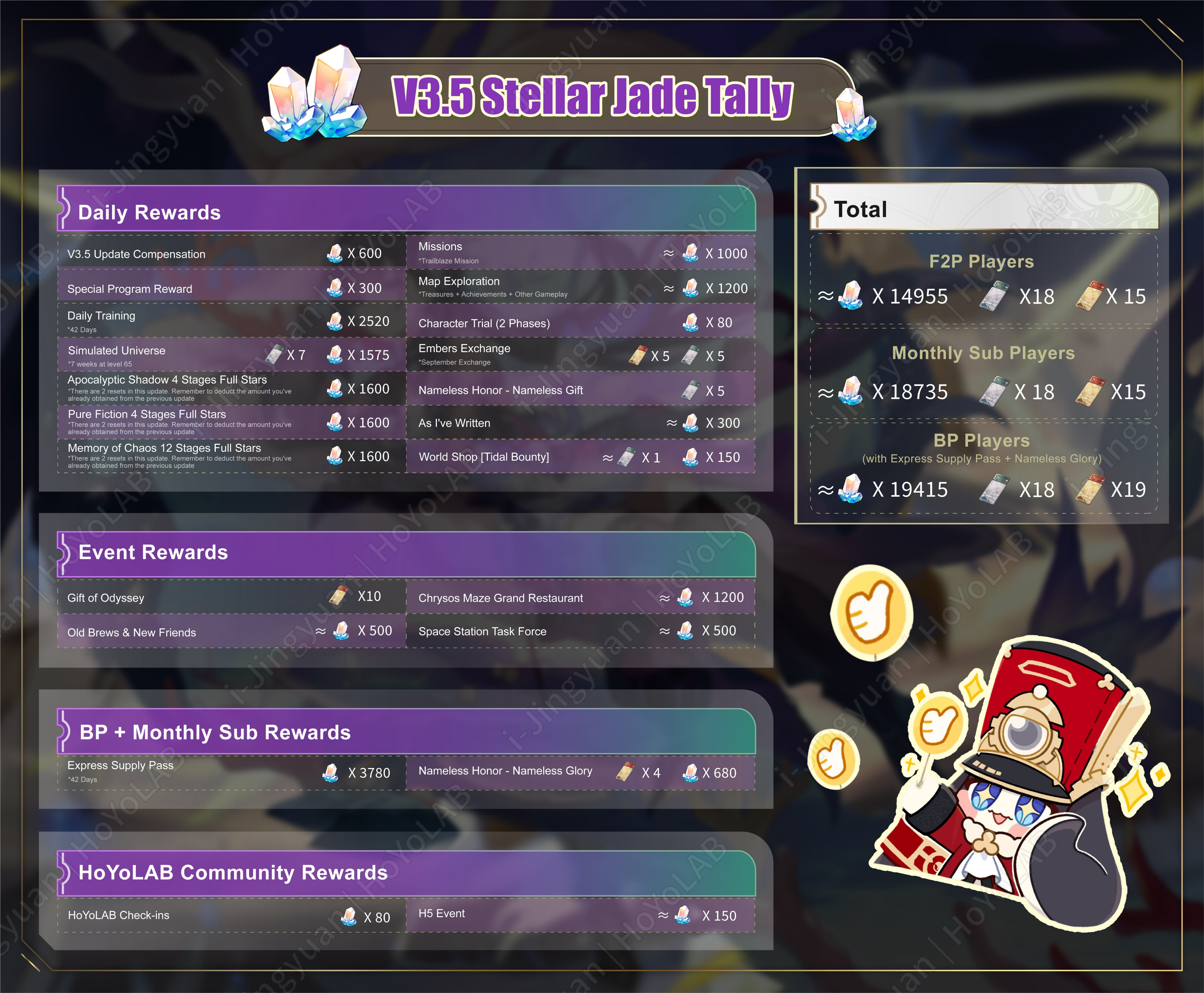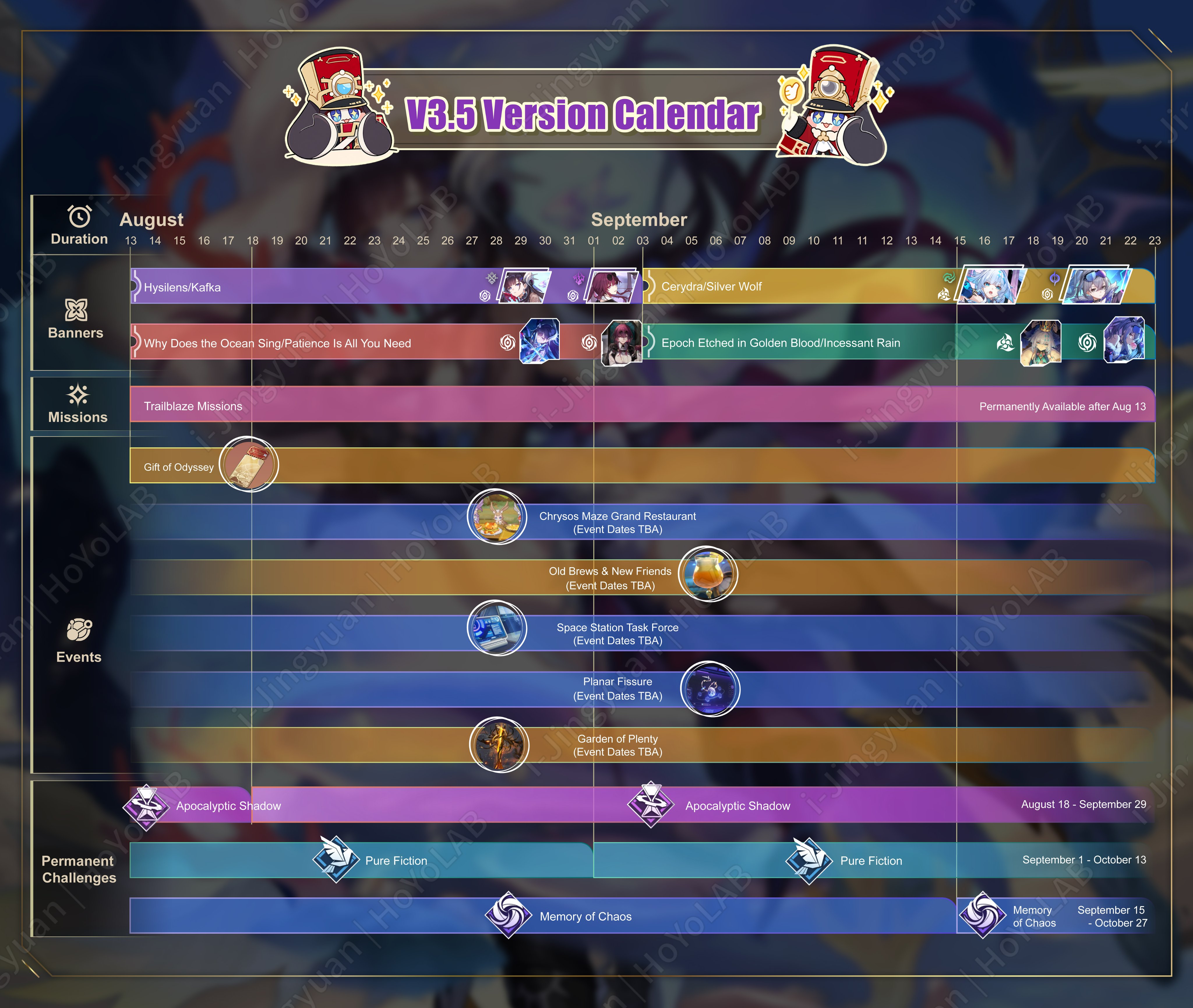 • Сегодняшний анонс Темени выходит спустя 3 месяца и 7 дней со дня годовщины H:SR. • Темень является 73 играбельным персонажем, а финал Амфореуса приходится на патч 3.7.