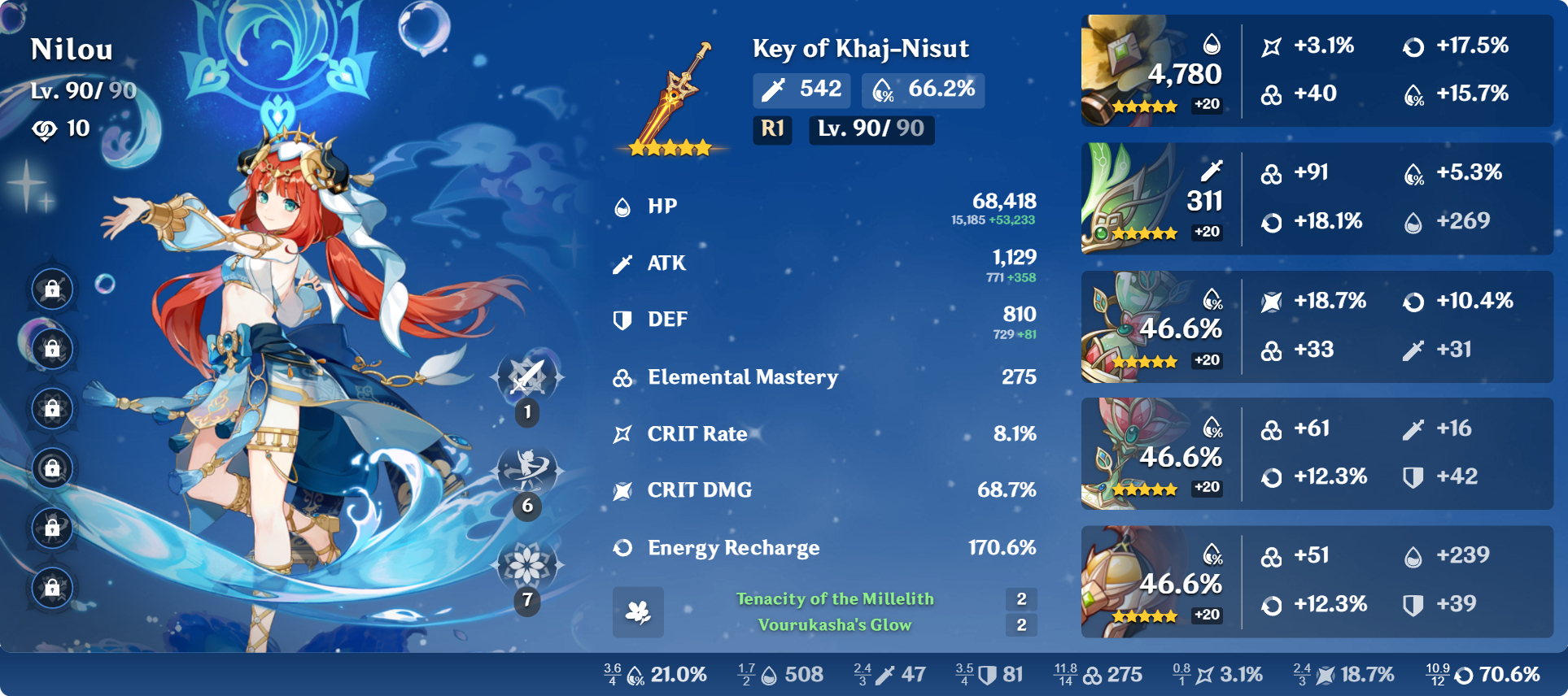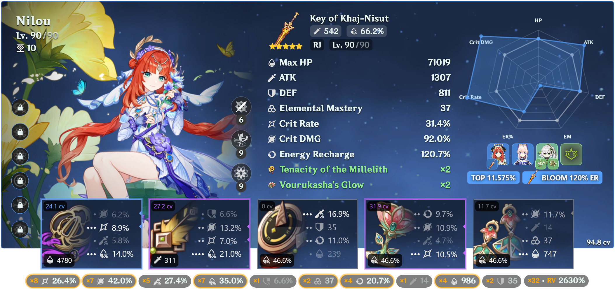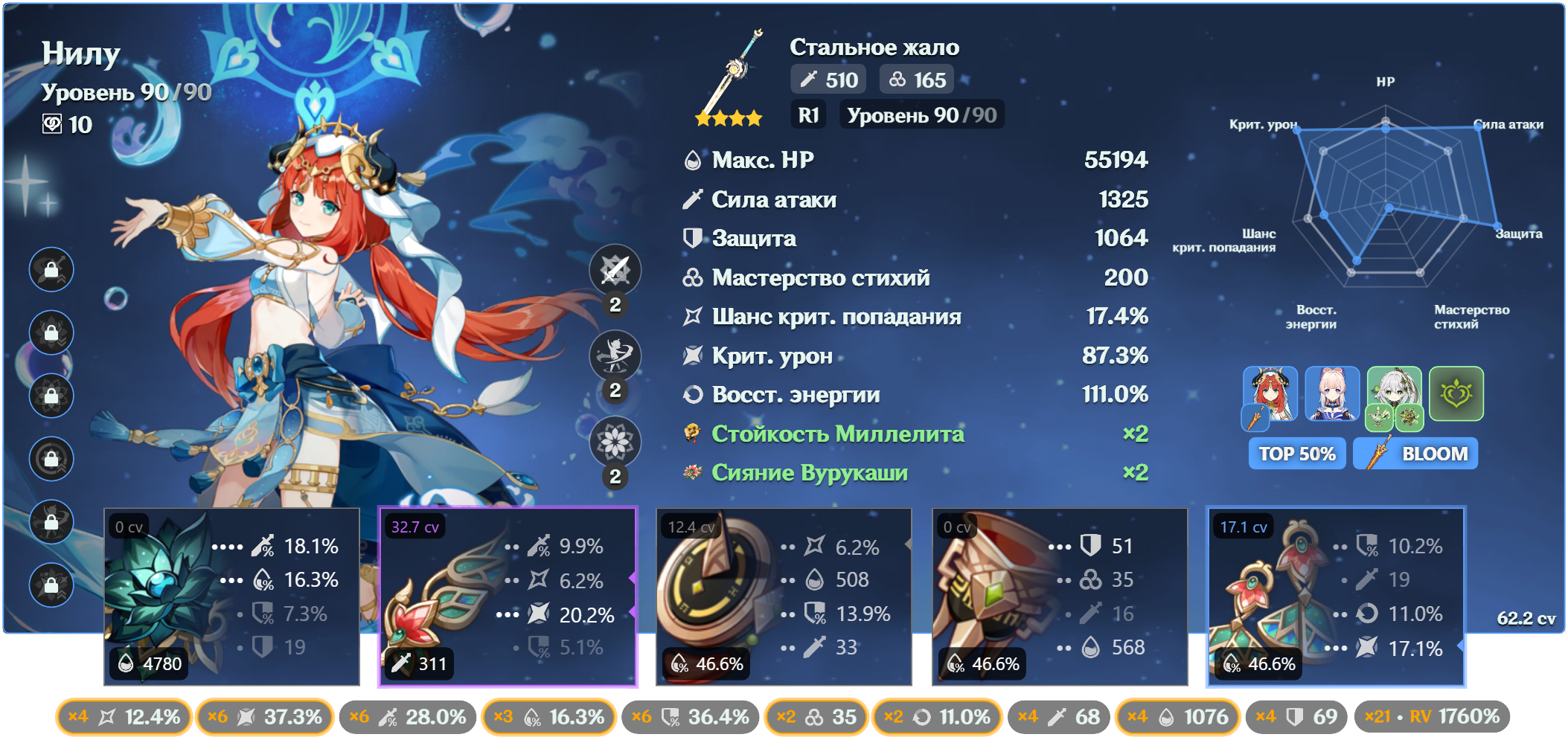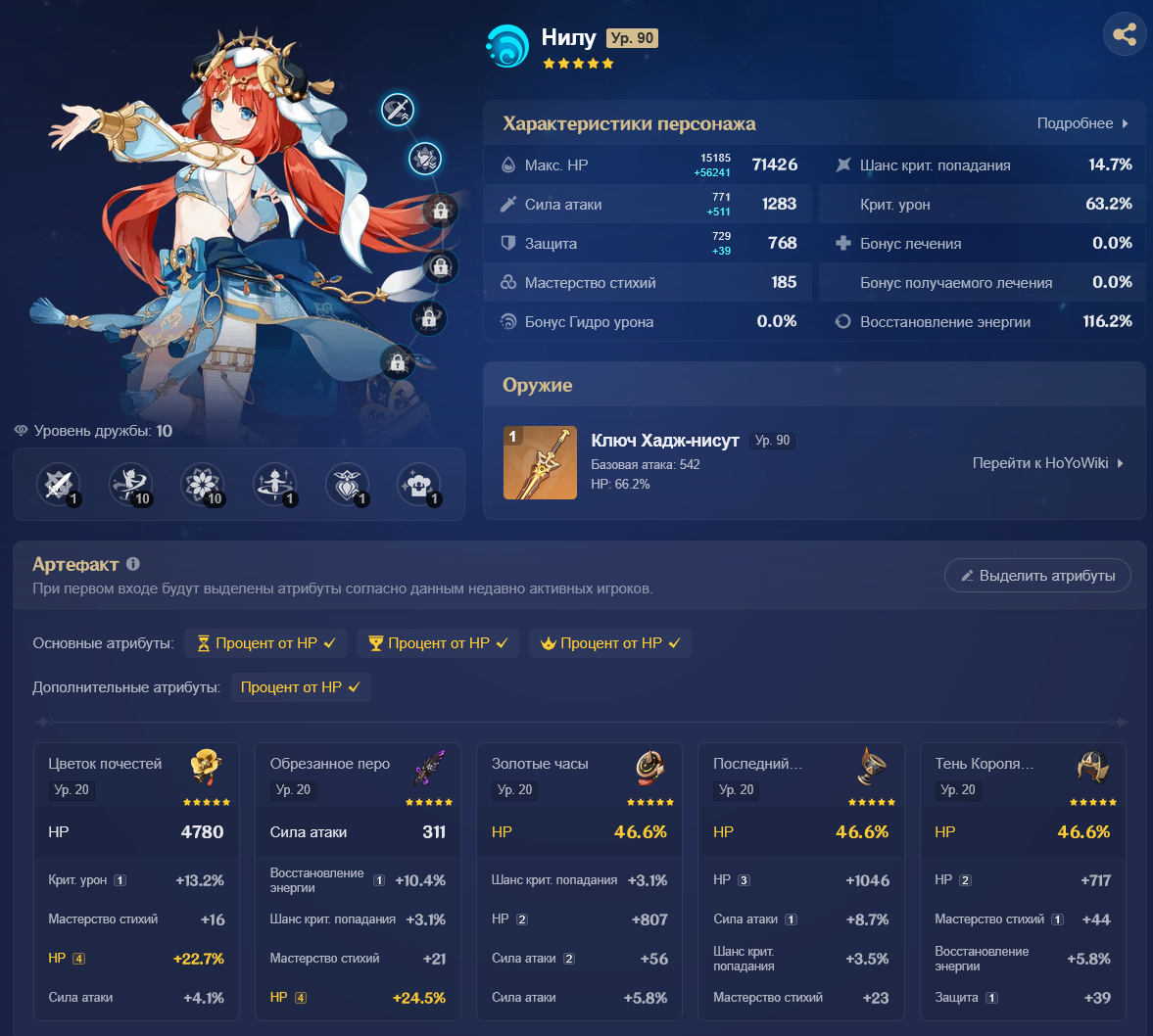 Без энергии она всё ещё баффает. В пачке с 1 нодкаловцем даёт +15% эффективного урона арбузов криты. И режет резисты к дендро и гидро. Но ульта тоже крайне важна и ее хочется нажимать каждую ротацию, а так как билдим мы ее фул мс и на криты кладем здоровенный болт просто статов не хватит, да и дамажит она не очень много, по сути у нее одна сильная тычка в ротации то надо как-то добрать калстановы. В некоторых пачках ей чуть ли не 200 калстановы надо. Да и с выходом нефер ее ульта станет ещё важнее так как бафф арбузов с ульты не так критичен как бафф директ лунар блум урона поскольку этот бафф скейлится от критов и реакшн бонуса нефер.