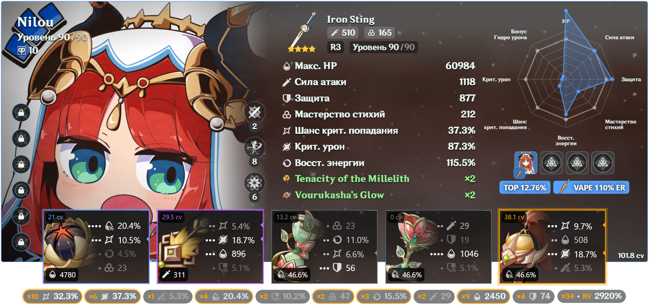 >>5510864 Зависит, но он всё равно кривой, RV не учитывает весь остальной билд. У меня вот флат хп не учитывает, на той нилу - может он думает что чар в вейпы играет, потому и посчитал криты - там же есть разные рейтинги, и им нужны разные статы.