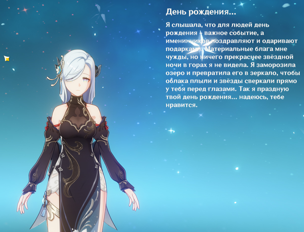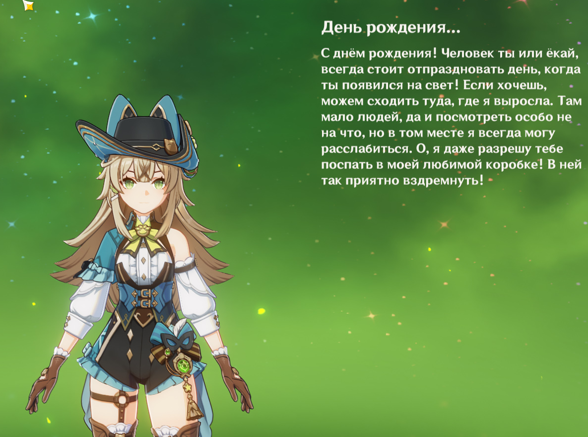 А смотрите какое у Шенхе пятизвёздочное поздравление. Только чего она такую инициативу берёт словно мужик, а я девочка? А Вареса вообще в свою коморку зачем-то тащит. Прикольно же. Линет предлагает достать из шляпы что пожелаешь. Но как она в шляпу поместится? Самое милое поздравление у Кли, а самое тупое у лисички, но смешное. Сейчас еще смешное у Кирары покажу ниже.