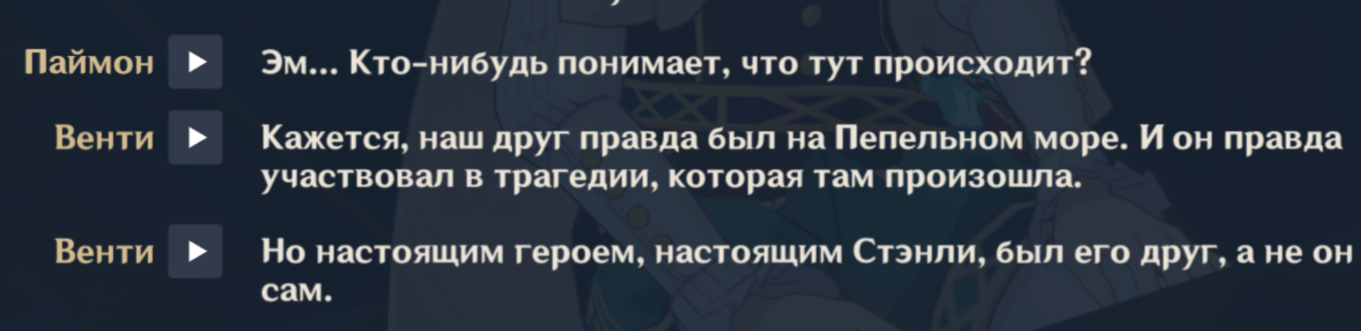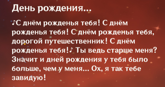 Ньювжушк на ночной связи. Сейчас от скуки закрываю совсем древний контент. Квесты персонажные 1.х версий. Насколько же слабее они были, часть ещё ничего так, типа Кли или Деда, но некоторые чисто пяти минутный лор растянуть на полчаса вроде Джинн или Дилюка. Но я не по этому поводу, чего пишу то, я реткон заметил. Как мы знаем из последнего квеста Натлана, Венти запечатал Пепельное море несколько столетий назад, но все типа не одупляют этого, это ок, но как это вяжется с вот этим челом, у которого друг несколько десятков лет назад там умер? И Венти даже ухом не ведёт, он даже нам об этом ни слова не говорит. Не, ну допустим нам не говорит, так как не доверяет ещё, но очевидные проёбы, не? Не, я нашёл там пару фраз, которые можно натянуть на глобус и оправдать ляо, но это очевиднейший реткон.