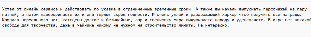 Долго думал почему я до сих пор играю в эту игру и пришел к выводу что я просто убиваю время в игре занимаясь какой то рутиной, при том что мне это не приносит какого либо удовольствие, играю почти с релиза и не могу понять почему играю.