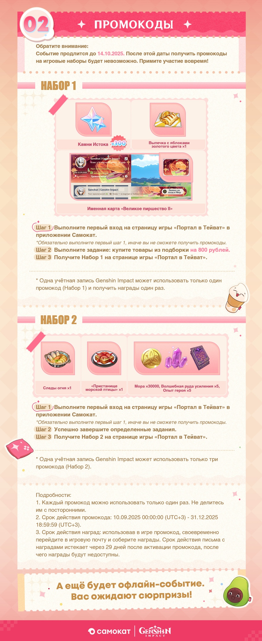 🔸 В период события переходите в приложение Самокат, приобретайте товары из подборки на 800 рублей, чтобы получить подарочные наборы (Камни Истока ×300, именную карту «Великое пиршество II» ×1 и выпечку с яблоками золотого цвета ×1). *Обязательно выполните первый вход на тематической странице игры «Портал в Тейват» в приложении Самоката перед покупкой, иначе вы не сможете получить промокод.