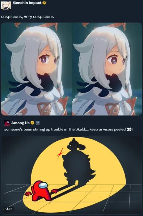 >Фанаты Genshin уверены, что эта тень — Паймон. Разработчики Among Us добавили подпись к изображению: «кто-то устраивает беспорядки в Скелде... держите визоры открытыми!».