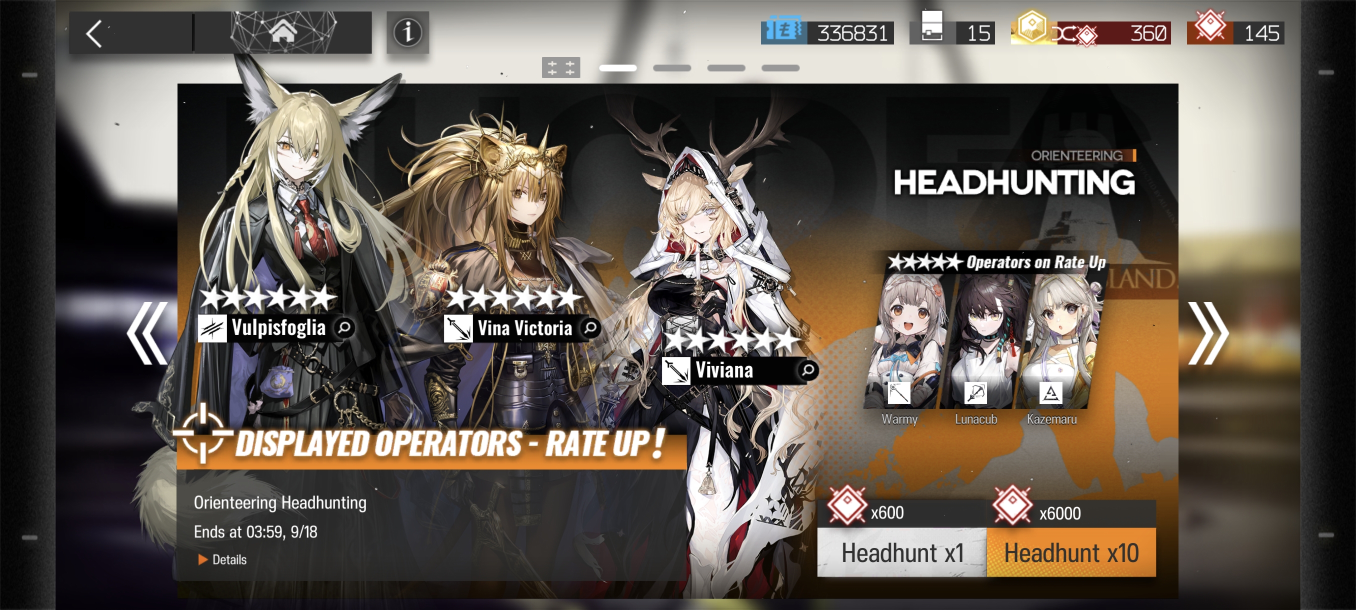 Баннер Orienteering Headhunting с 4 сентября до 18 сентября Суть баннера: вы выбираете трёх из шести предложенных в списке 6★ и 5★ оперативников. В случае 6★, выпасть в баннере могут только выбранные оперативники, в случае 5★, вы просто повышаете их шанс выпадения. 6★: Hoederer / Logos / Vina Victoria / Stainless / Viviana / Vulpisfoglia 5★: Lunacub / Fang the Fire-Sharpened / Warmy / Grain Buds / Kazemaru / Blacknight