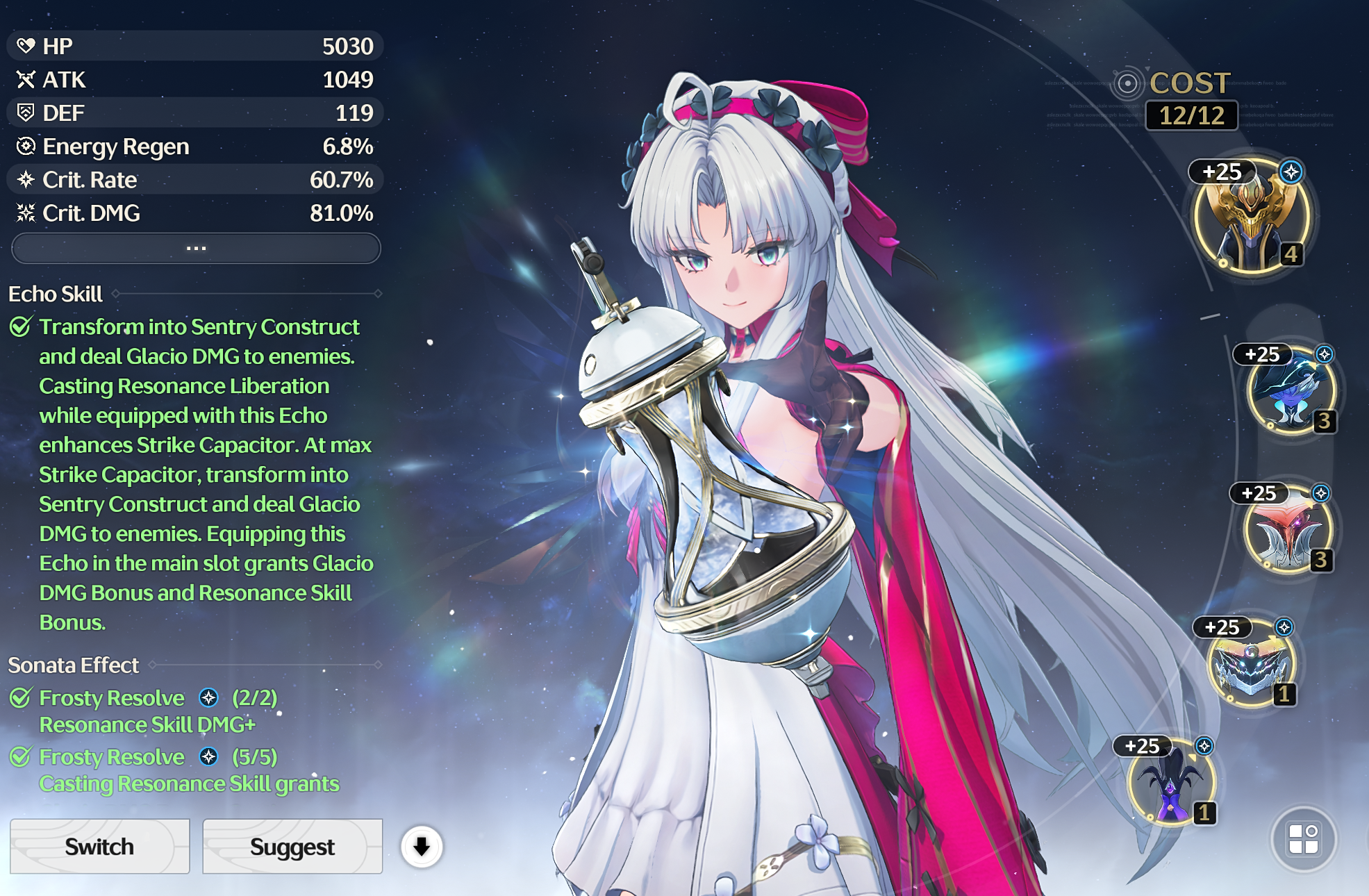 баффы цююаня: - ульта: за каждый 1% крит. шанса у цююаня выше 50% повышает крит. урон союзникам на 2%, до 30% на 30 секунд (то бишь для капа на цююане нужно всего 65% кш) - бафф к урону эхо для союзников при заполнении шкалы цююаня: +30% - аутро: +50% к урону эхо для следующего союзника