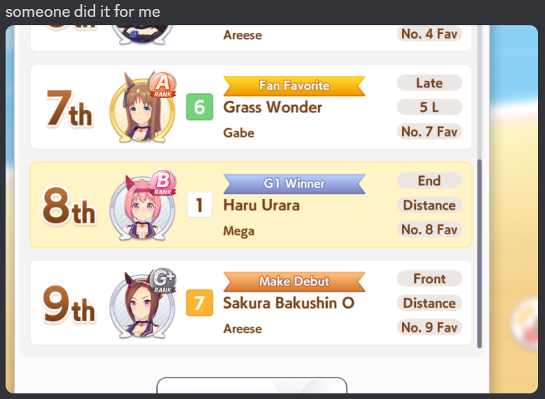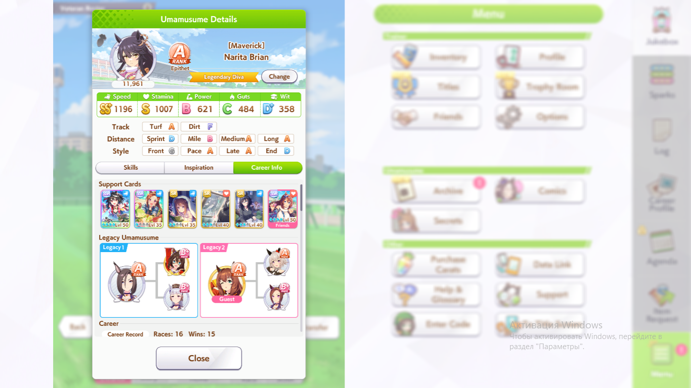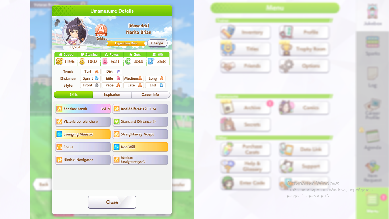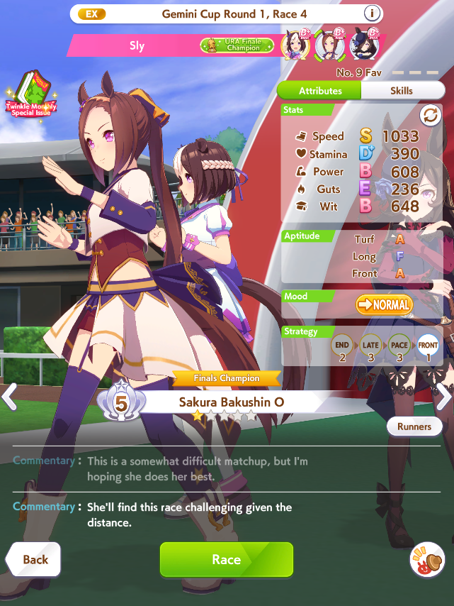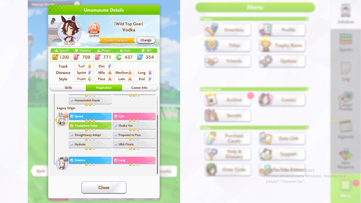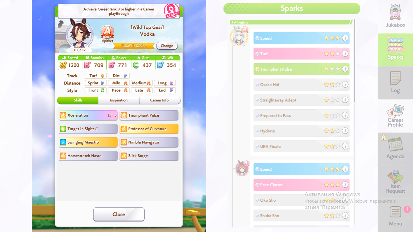 Кстати, вот такая Бакусин не осилила Уру. Да понимаю что играл вообще не серьёзно, подбирал лишние гонки абы как, даже на радужках, не парился с родителями, лишь бы миля была А, и вообще взял только для того чтобы ачивку в ивенте закрыть, там спринт был который я еще не бегал, но всё-таки. Даже за неё что бы пройти надо напрягаться, при всяких Китасанах млб и т.д.