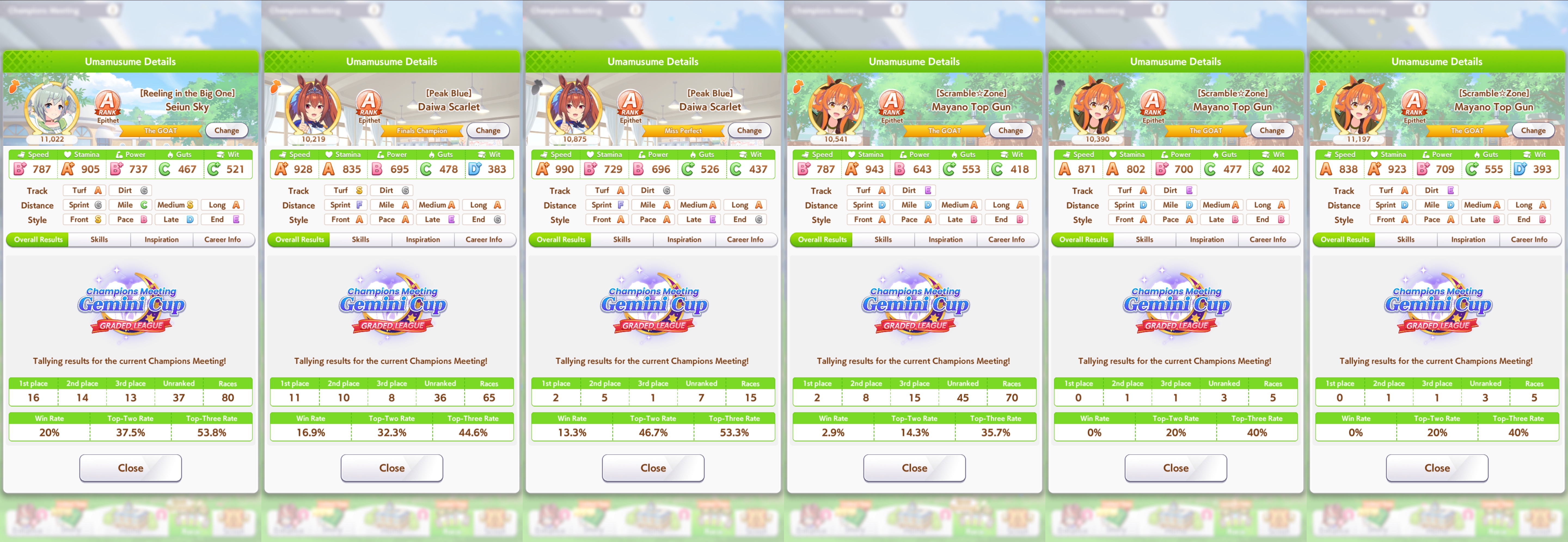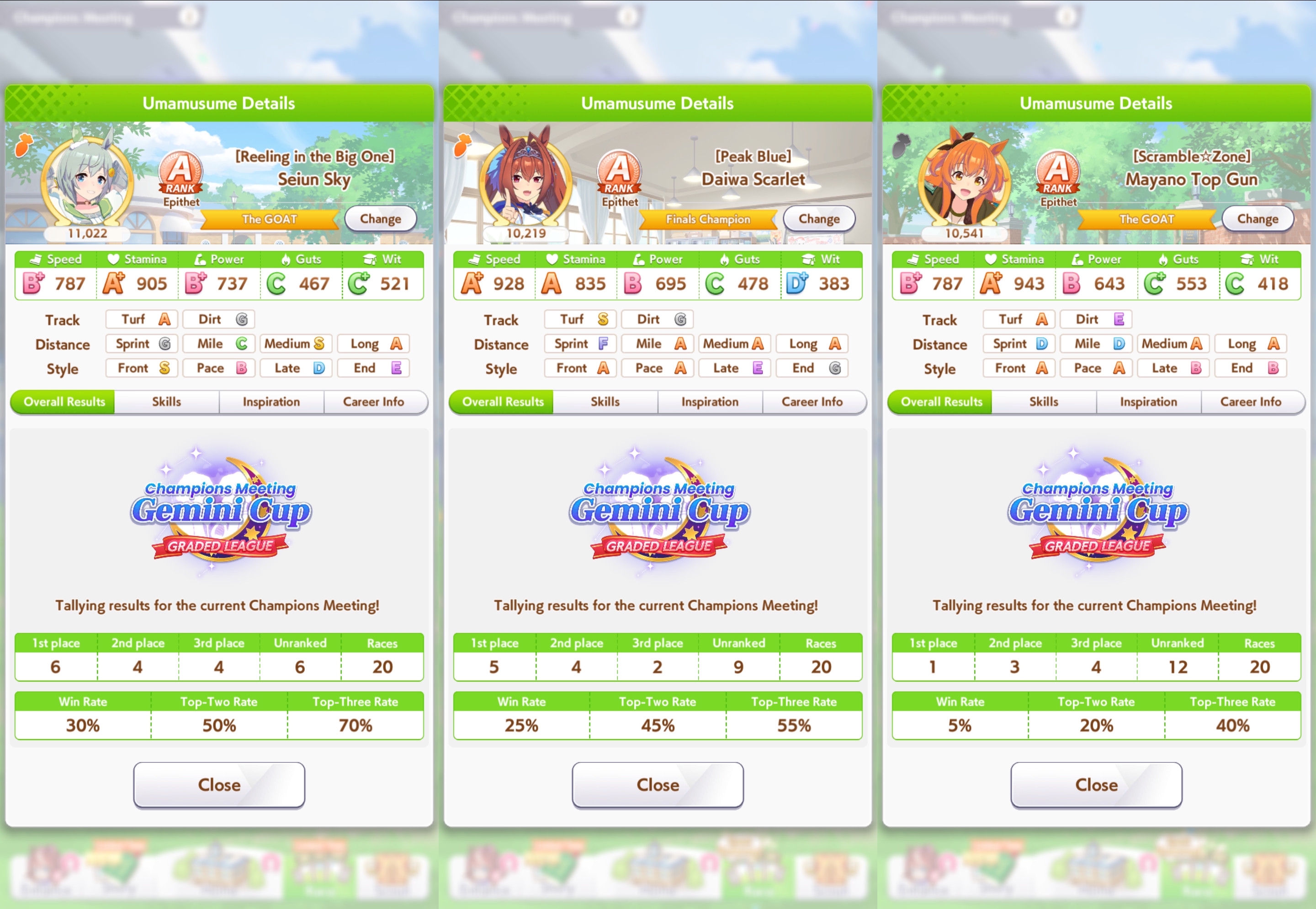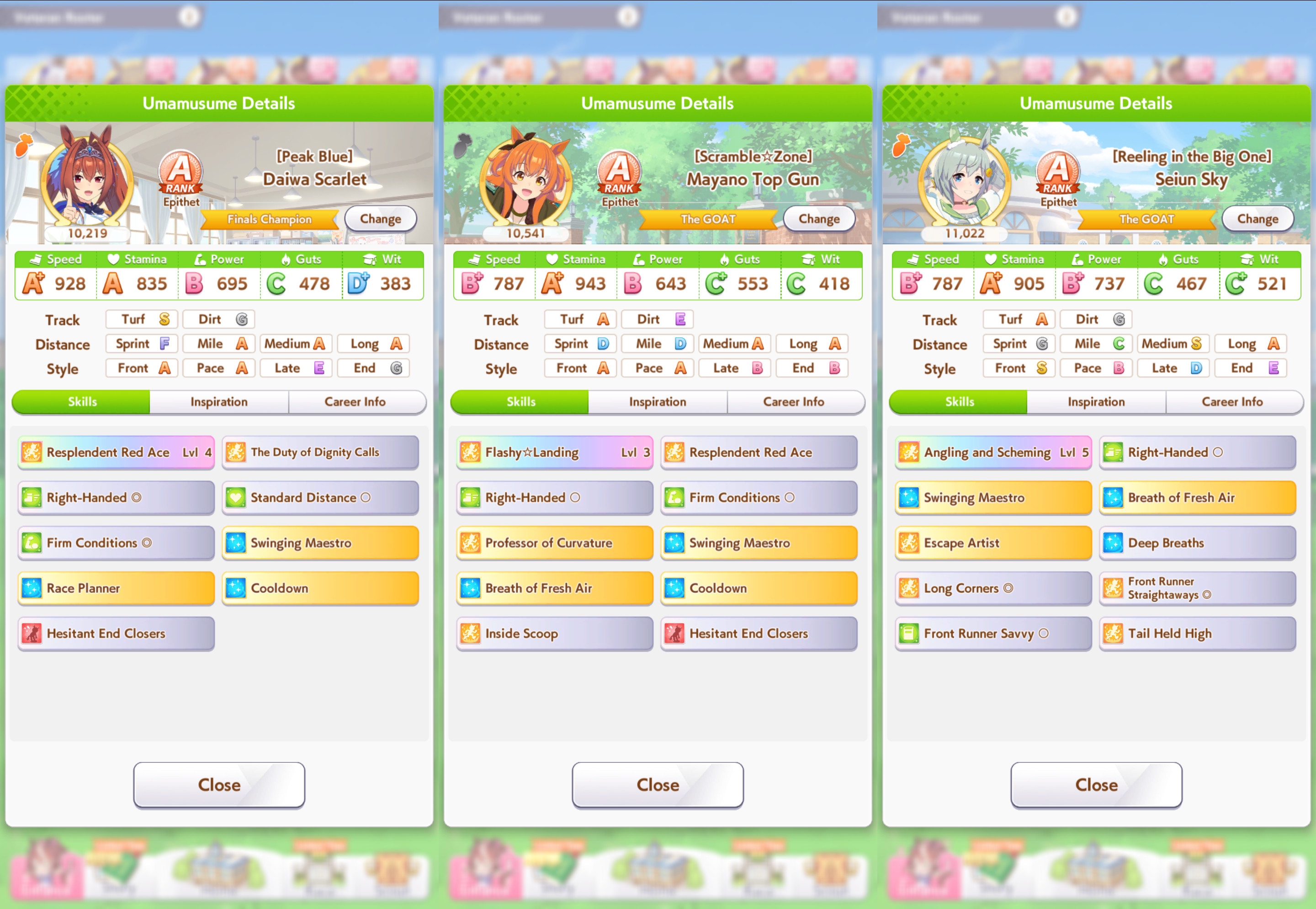 Сеюн Скай интеллектом давит (не шучу), а Дайва Скарлет иногда идёт на обгон и включает свою уникальную способность (круче спурта и даже золотого умения Тайшин между прочим). Ну а Маяно Топ Ган просто выживает и заставляет бежать быстрее Сеюн Скай, самой ей тяжело ей что-то выигрывать, оно и неудивительно, скиллпойнты пошли в восстановление, а такой крутой уникальной как у Дайвы у неё нет, точнее есть но активировать сложно.