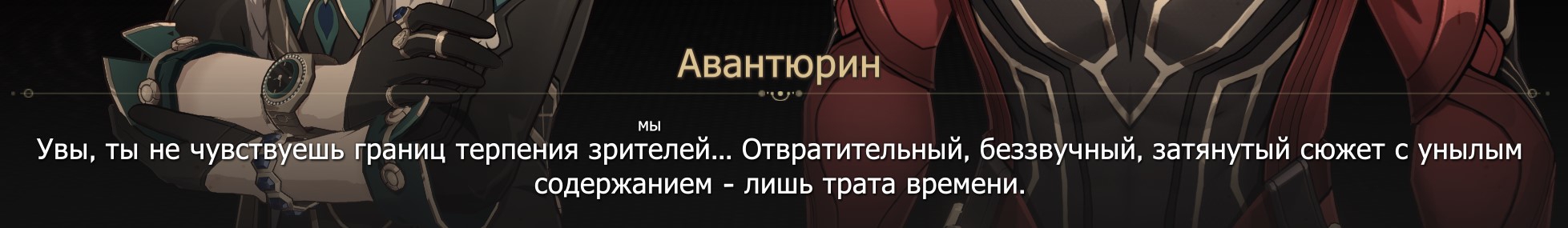 Прошел коллабный квест, кто там пиздел на него? Это же чистый постмодерн, отрубить озвучку в середине квесте и объяснить это немым кино это просто гениально, а англюсикоебы даже и не поняли, наверное, такой троллинг от Ляо. Другие метаприколы типа авторских прав на персонажа, подъебы скипальщиков и самоирония это круто. А в конце Ляо прямо от своего лица в виде Отто начал говорить. Короче, что бананы, что это ахуенные квесты, которые быдло как всегда не смогло выкупить и захейтило.