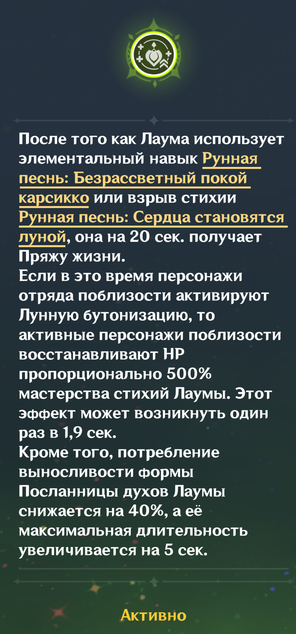 Но, как только ты ставишь второго нод-краевца, у тебя первая часть пассивки Лаумы отключается и бутон/бутон+электро/бутон+пиро не критуют, но зато ЛУННАЯ БУТОНИЗАЦИЯ, которая к слову пока один единственный нахуй ебаный ПУК от Ешки Лаумы, получает +10кш и +20Ку.