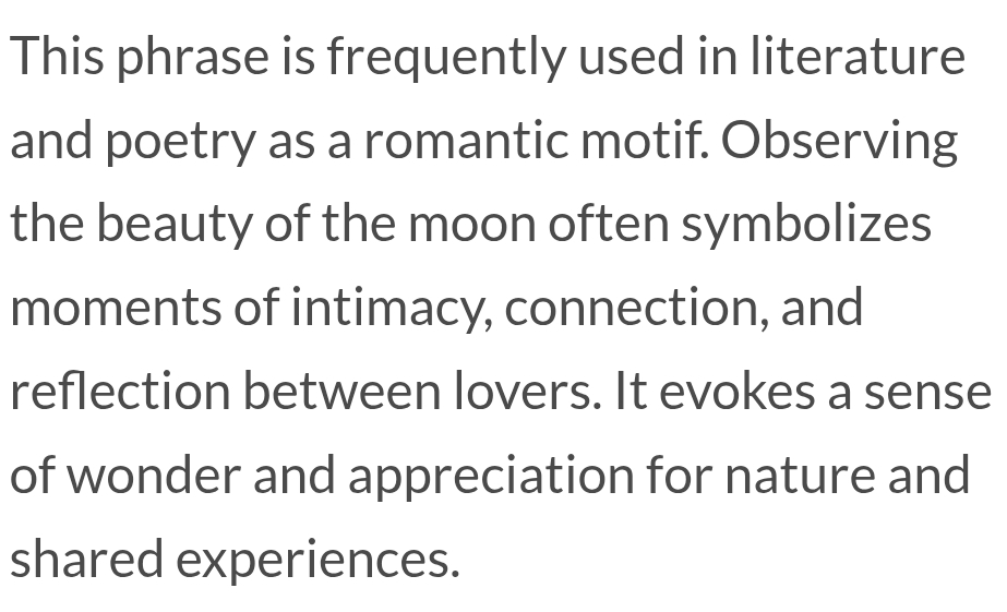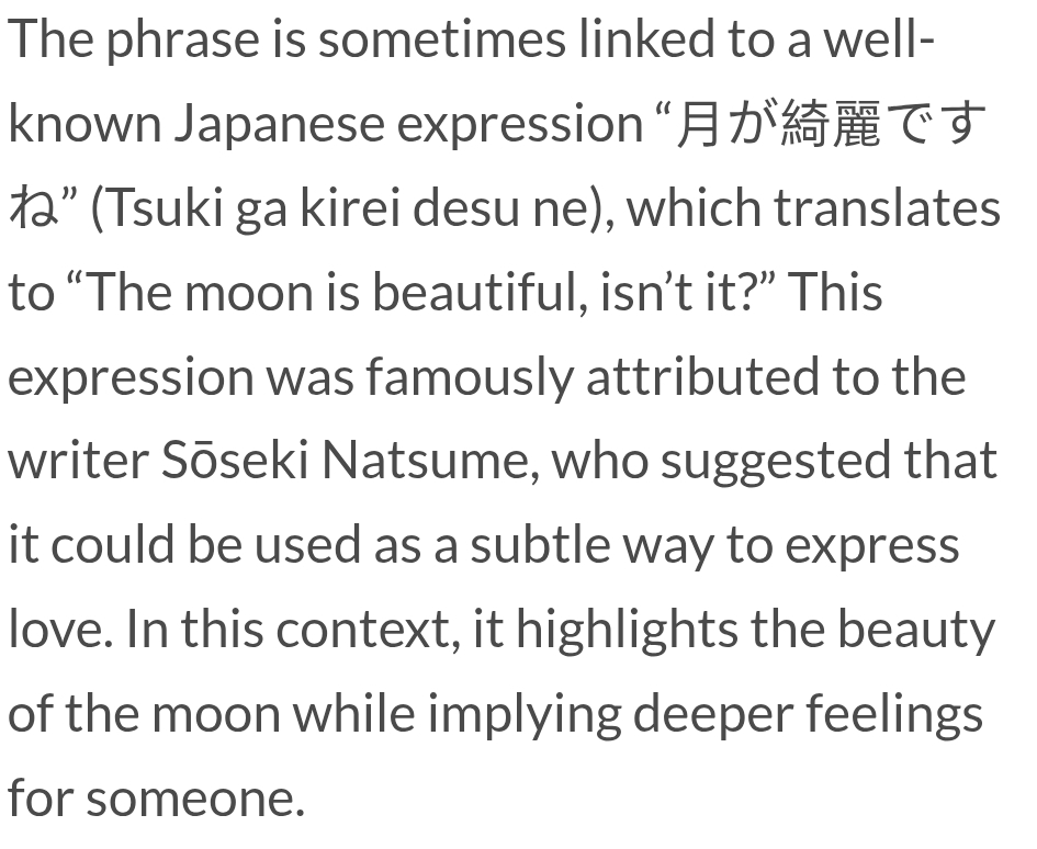 >>5578924 >ну и затем эта фраза про луну. Там не может никаких «но», китайская фраза: 今夜这里的月色很美 — прямой аналог японской 月が綺麗ですね, это та самая классическая фраза-признание в любви.