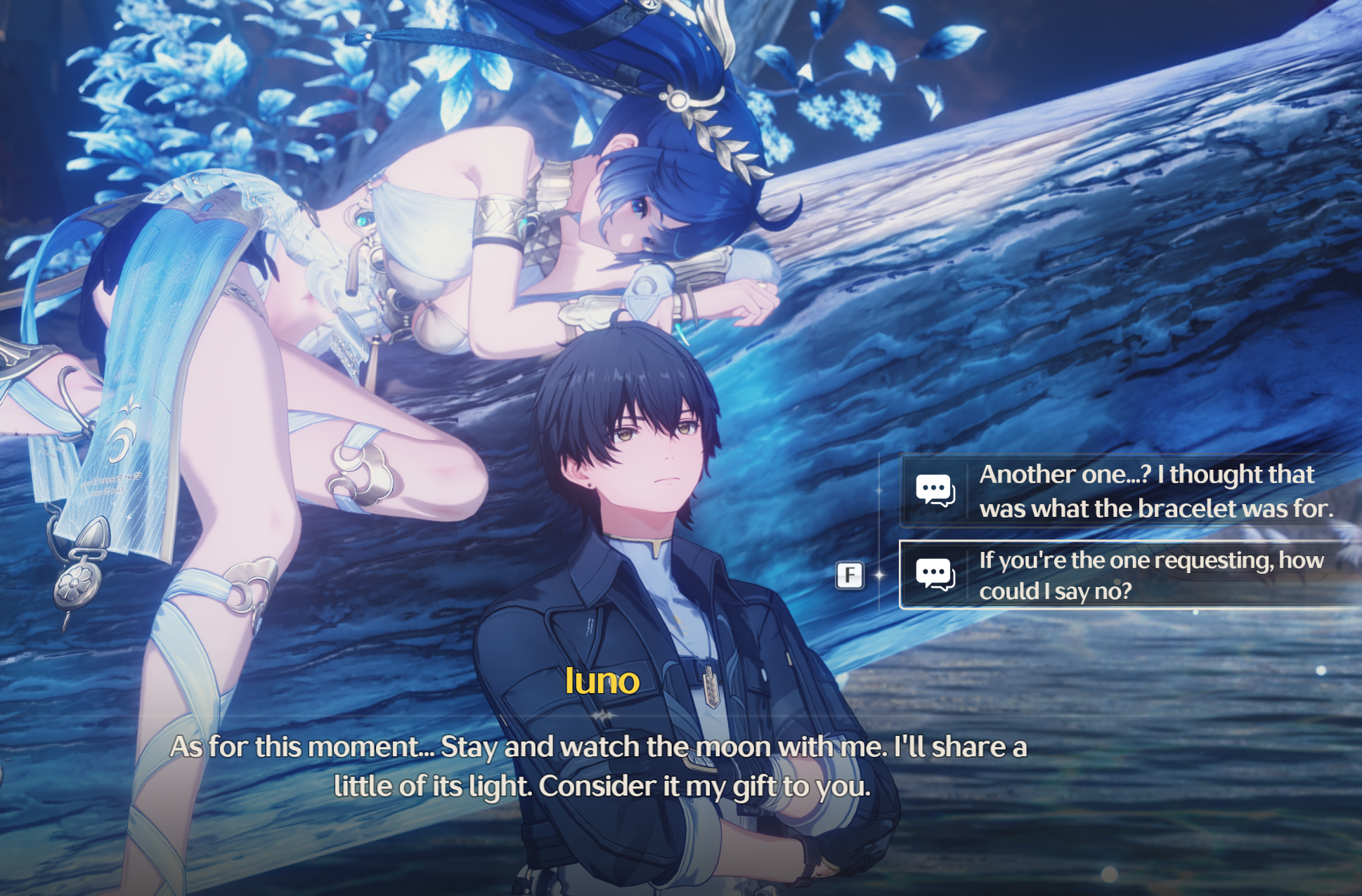 >>5577695 >>5577725 Посмотрел весь это диалог, просто ультраюшковый. Пока не смотрел англ, но она в китайском сперва прямым текстом обыгрывает идиому про луну в воде (недостижимость, тщетность каких-либо усилий), вот только она указывает, что (Ю) сделал невозможное возможным: поймал "луну" (её). Особенно момент: Юнона: «А теперь... посмотри на луну вместе со мной. Я поделюсь с тобой здешним лунным светом. Считай это... ответным подарком за то, что вернул меня сюда». Ровер: «А я думал, браслет был ответным подарком». Юнона: «Я же говорила, что я очень щедрая. Особенно по отношению к тебе... Одного ответного подарка будет слишком мало». ну и затем эта фраза про луну. Там не может никаких «но», китайская фраза: 今夜这里的月色很美 — прямой аналог японской 月が綺麗ですね, это та самая классическая фраза-признание в любви.