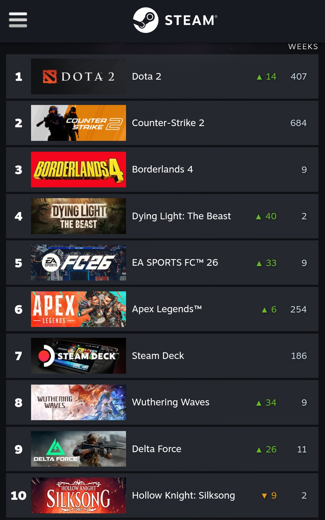>>5581235 Не, у нее было то ли 8 то ли 9 место и то с учетом русского акка, где часть игр не показывалось. Тут если бы я со своего стим акка заходил(а я проверял) - было бы 4ое место, потому что не показывалось бы ни бордерлендса ни еще некоторых игр.