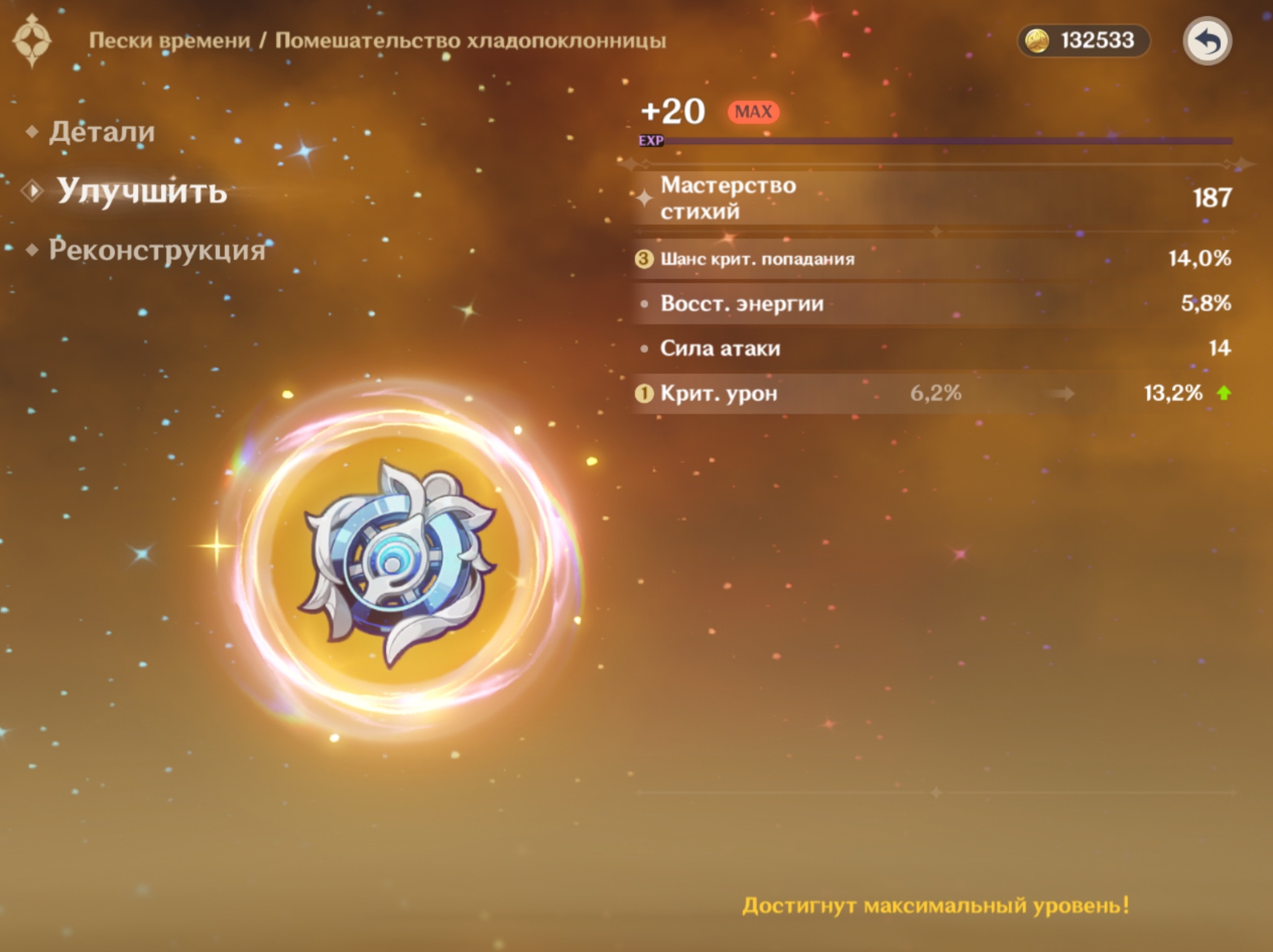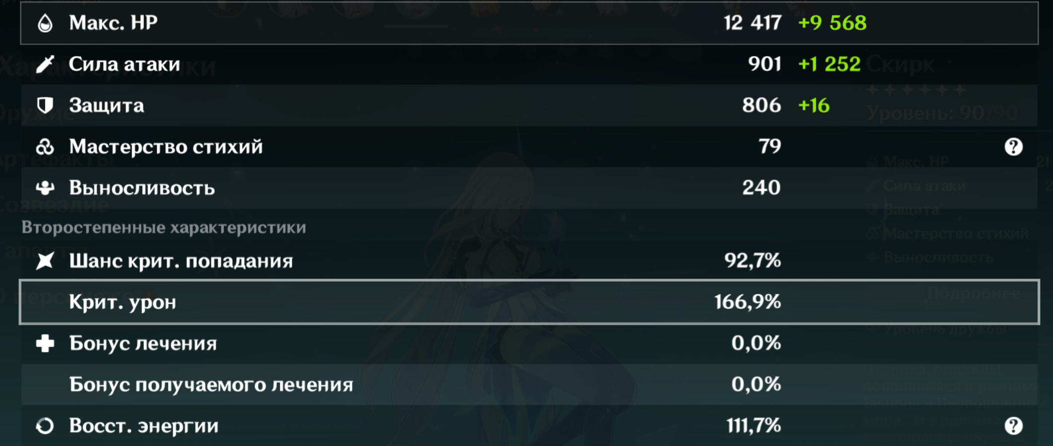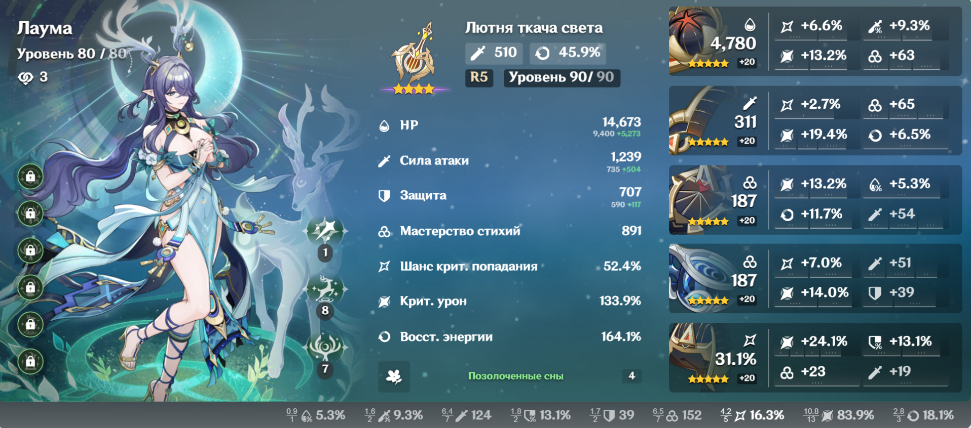 1к мс собрали, востановы под 180, остальное в атаку и криты. Бутоны критуют с шансом 15%, при 2 луне 30 есл не ошибаюсь и это еще складывается с 15% Нахиды с2. Шмот на криты бутонов не влияет, только на холд Е Лаумы.