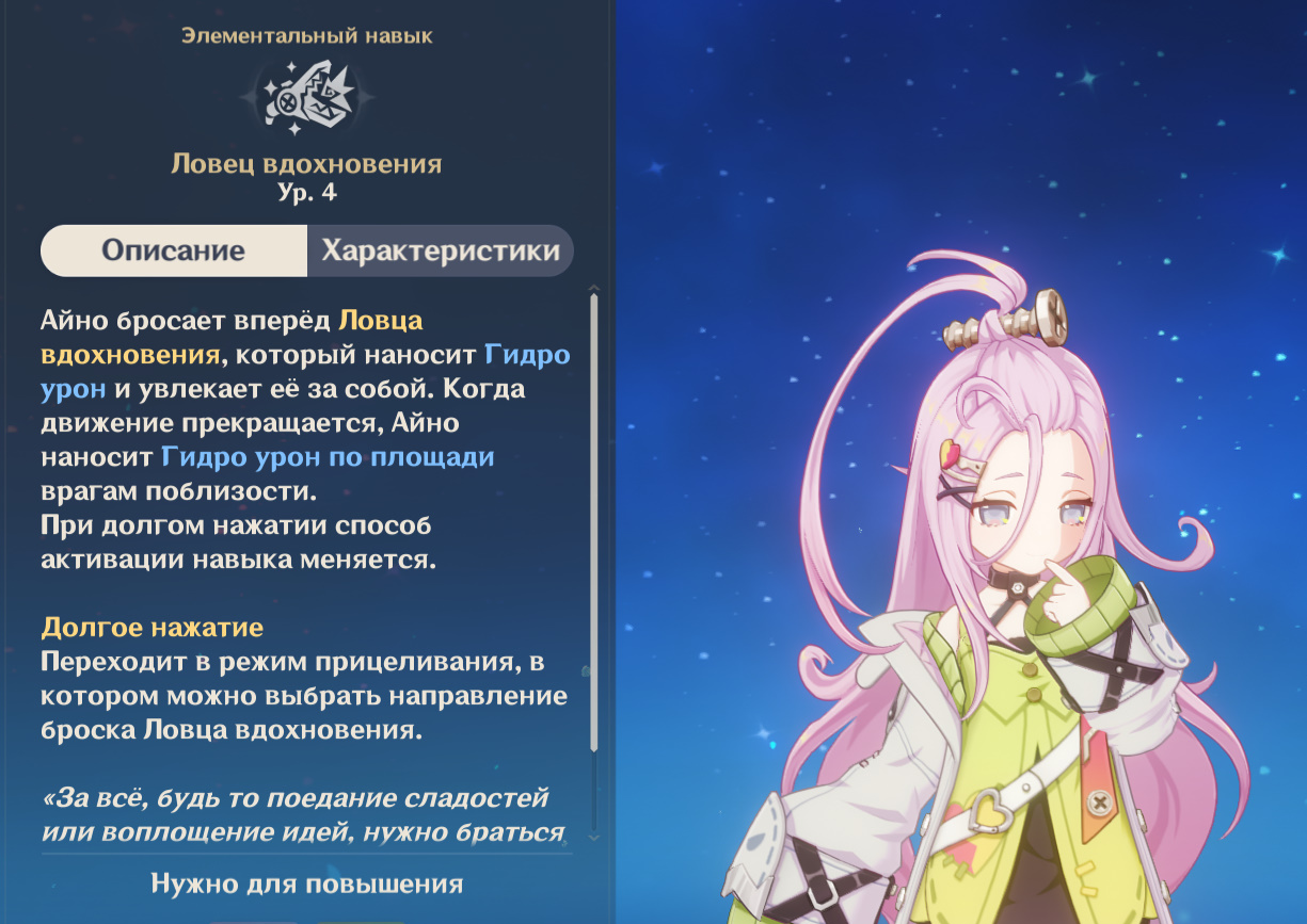 Как у Лаумы в кнопках и талантах буквами насрато, а у Айно зато просто всё по минимализму. Ебаный шизофреник кто геймплей выдумывл. дендро итак было калом. До сих пор не помню все названия дендро реакций.