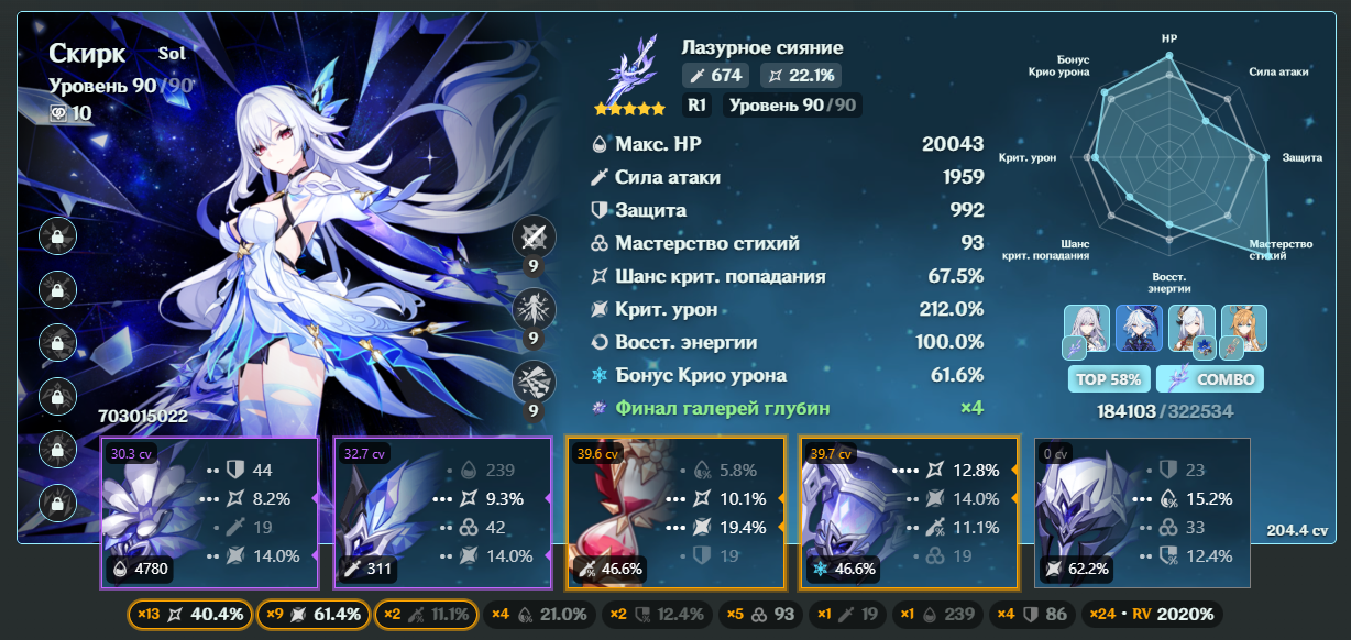 Шэнь Хэ с р1 сигной, Эскофье с р1 хомой, ешкосетом и кубком на атаку, у Скирк р1 омут, сигнатурный сет, шапка на атаку и крио кубок, у Богини пресвятой фавоний и ешкосет на 38к хп.