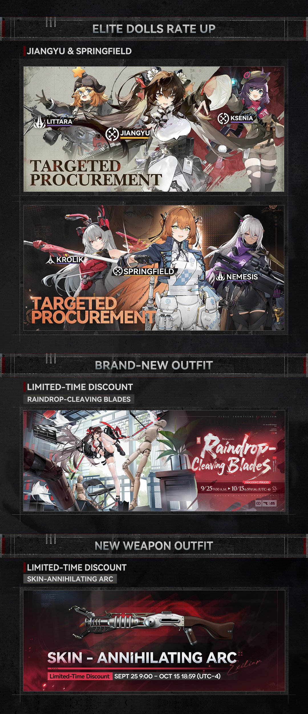 баннеры: - Хелен (DP-12) Фризбулварк, обладающая множеством навыков поддержки в своем снаряжении -Фаэтуса (оригинал GFL2) Коррозия - персонаж ближнего боя, о ее снаряжении мы узнаем позже. Селектор баннер с изображением Душеваной, Левы, Мечты и жопкиты и их оружия на баннере.