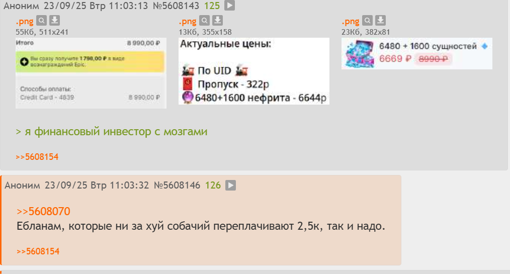 >>5608181 во-первых, я живу по принципу что скупой платит дважды и это себе дороже во-вторых, с кэшбэком эпика я "перплатил" только 548 рублей, но зато я не трясусь что мой аккаунт оплатили с краденой кредитки куда потом отзовут деньги чарджбэком а гемы уйдут в минус