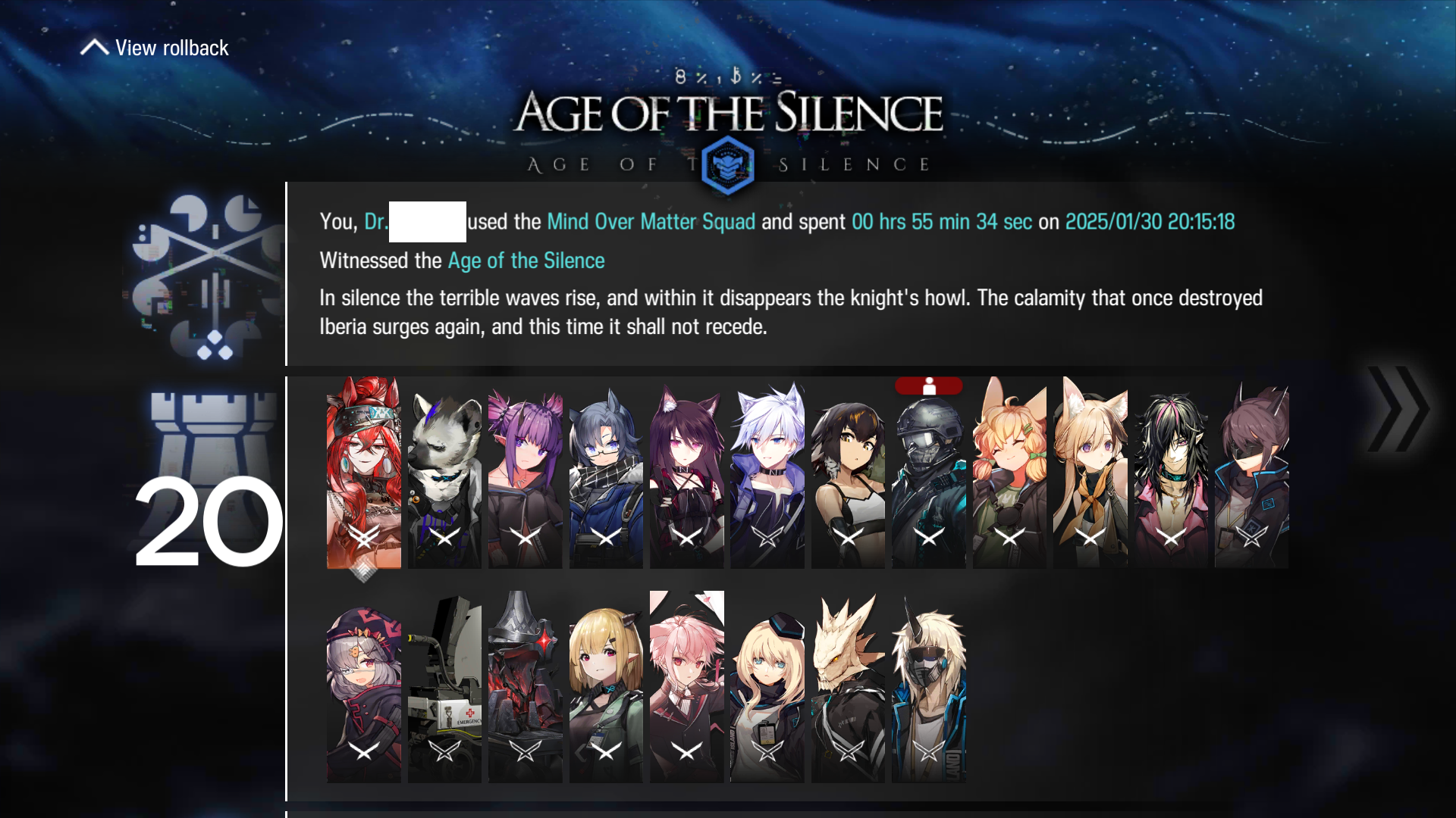 С 16 сентября на глобальный сервер пришла пятнадцатая глава, начинающая третью сюжетную арку. Начинаются лорные бомбы, исчезновение Кальцитовны и прочие ВОТЭТОПОВОРОТЫ. В честь этого запущен баннер «Command: Reconstruction» (с 16.09 по 30.09) 6★ — Mon3tr 5★ — Alanna / Cement 4★ — Windscoot Также в ограниченный период времени (с 16.09 по 30.09) проходит поощрительный ивент, суть которого заключается в том, что санити не снимается при провале ЛЮБОЙ карты пятнадцатой главы. Заодно подвезли новые скины в честь прошедшего концерта Ambience Synesthesia, реранятся старые, подтащили новый комплект мебели для дорма, в магазине продаются специальные донатные паки исключительно для нового баннера