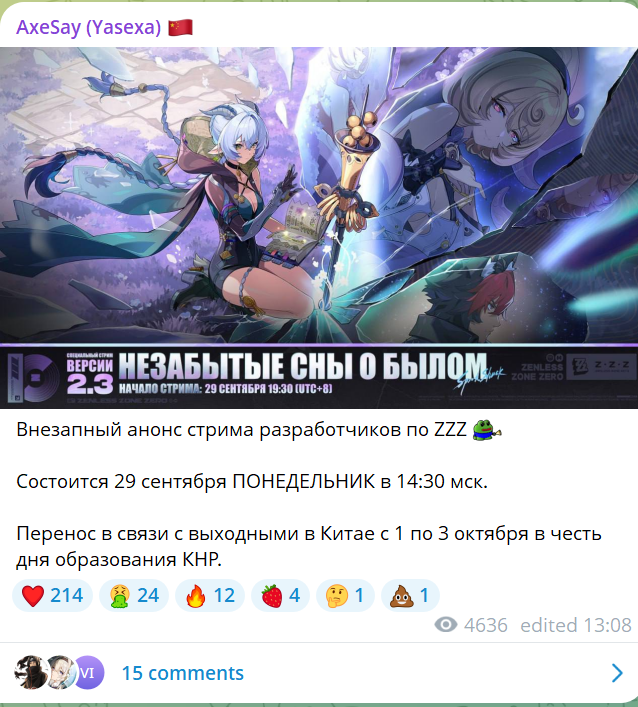 Привет, прокси! Специальный стрим версии 2.3 Zenless Zone Zero «Незабытые сны о былом» начнётся 29 сентября в 19:30 (UTC+8).