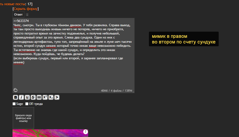 >>5633374 Чипс, смотри. Ты в глубоком тёмном данжон. У тебя развилка. Справа выход, ты там просто выходишь живым ничего не потеряв, ничего не приобретя, просто потратил время на зачистку подземелья, и получив небольшой, справедливый опыт за это время. Слева два сундука. Один из них с легендарным артефактом, тупо топ, запрещённый на земле и луне меч тысячи истин, второй сундук мимик который точно никак ваще невозможно победить. Ты естетвенно не знаешь где какой сундук, и определить это никак невозможно. Куда пойдёшь, че будешь делать? (если выберешь сундук, первый или второй, я заранее запланировал где мимик)