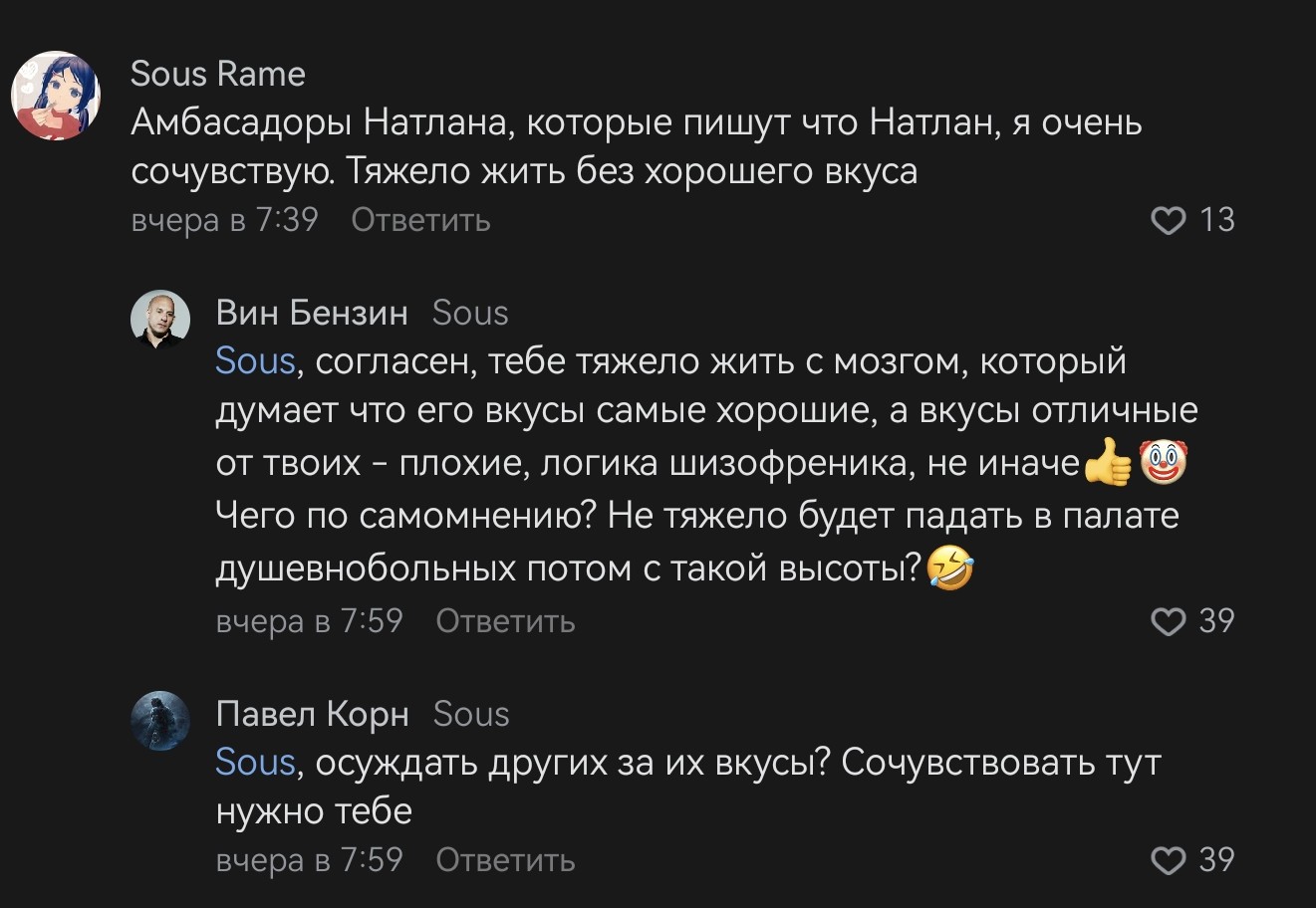 Самое смешное это как все визгуны с натлана за обе щеки уплетают нодкраевскую айно, детсадовскую девочку высравшую из жопу миллион технологий которых боятся даже фатуи. Вот это ворлд билдинг, вот это сюжет, вот это да. Не то, что эта ваша шилонен, старая и опытная инженерша основывающая свою работу на чертежах сверхцивилизации.