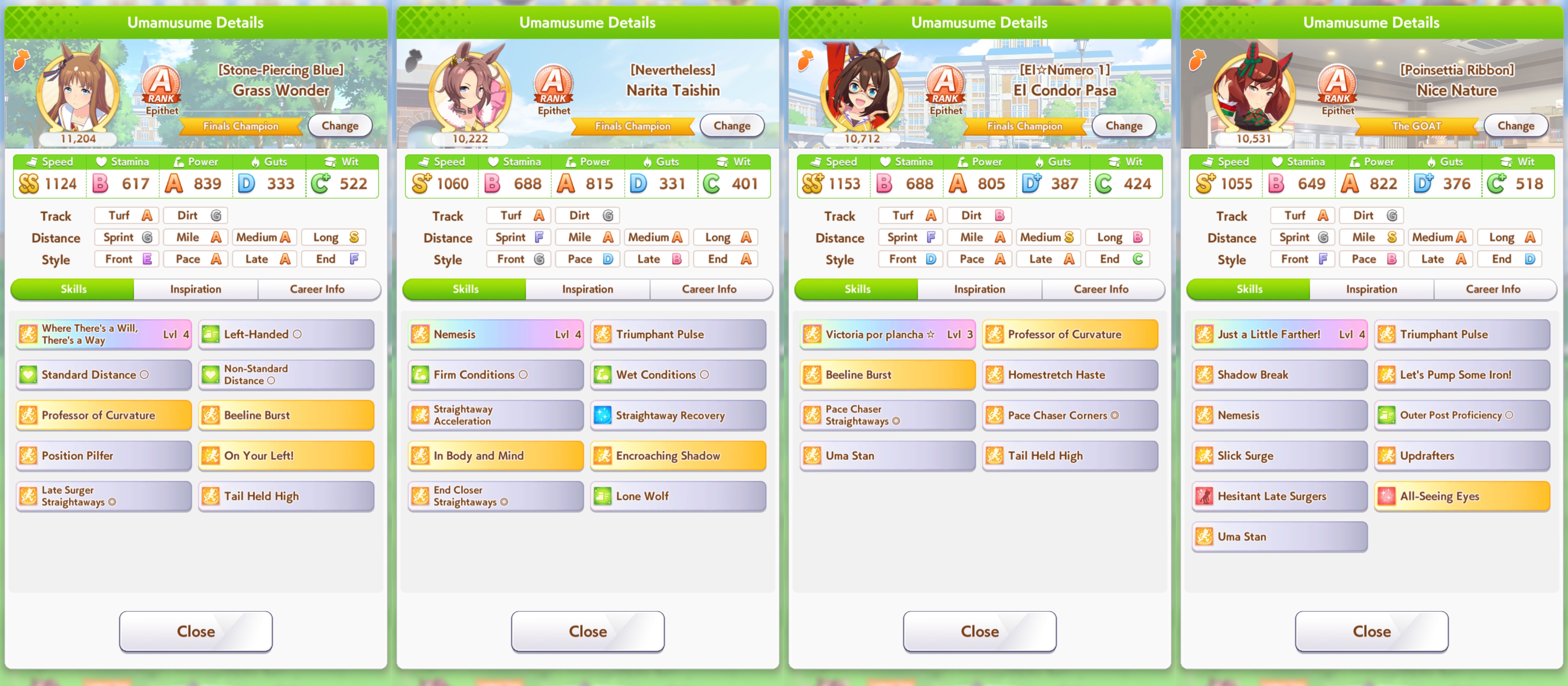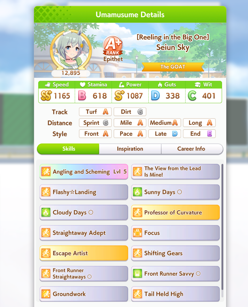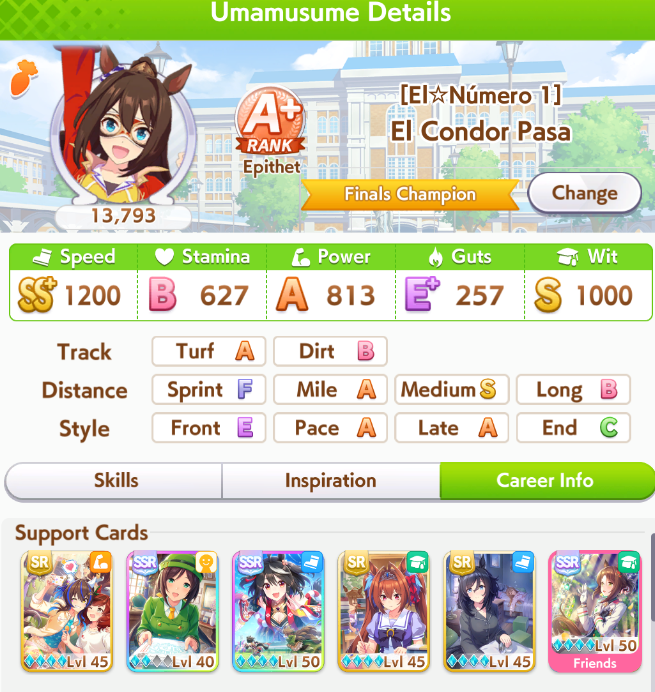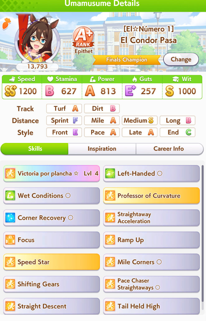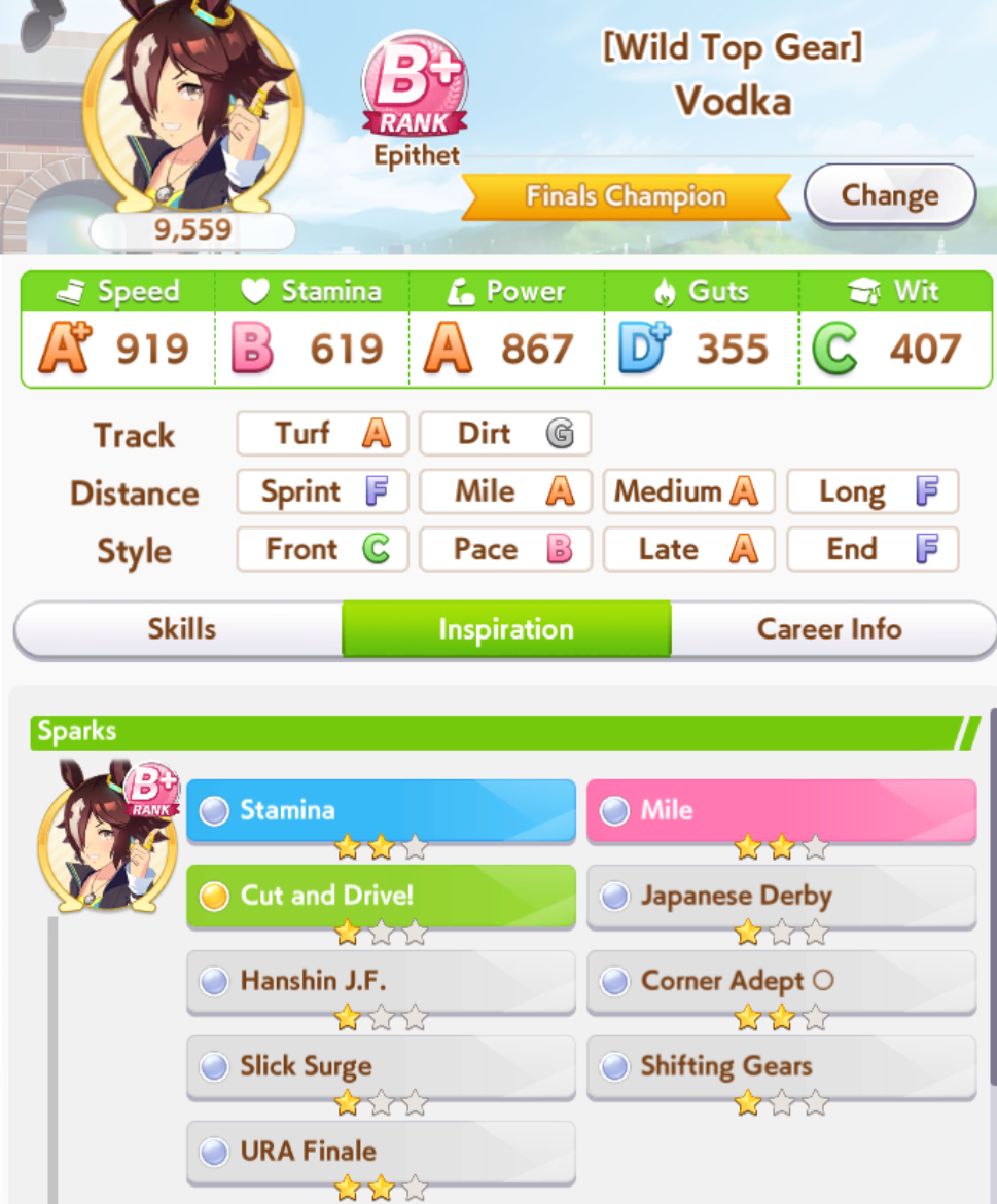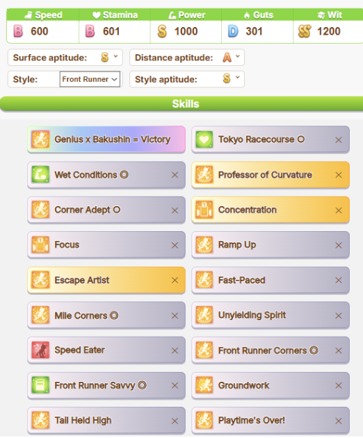 >>5626919 Умения собрать это рандом, как повезет. Ну или можно конечно забрутфорсить так сказать кучей карьер, рано или поздно совпадут и статы и умения (может быть) и ещё какой-нибудь S накинет в нужную дистанцию или тип ипподрома.