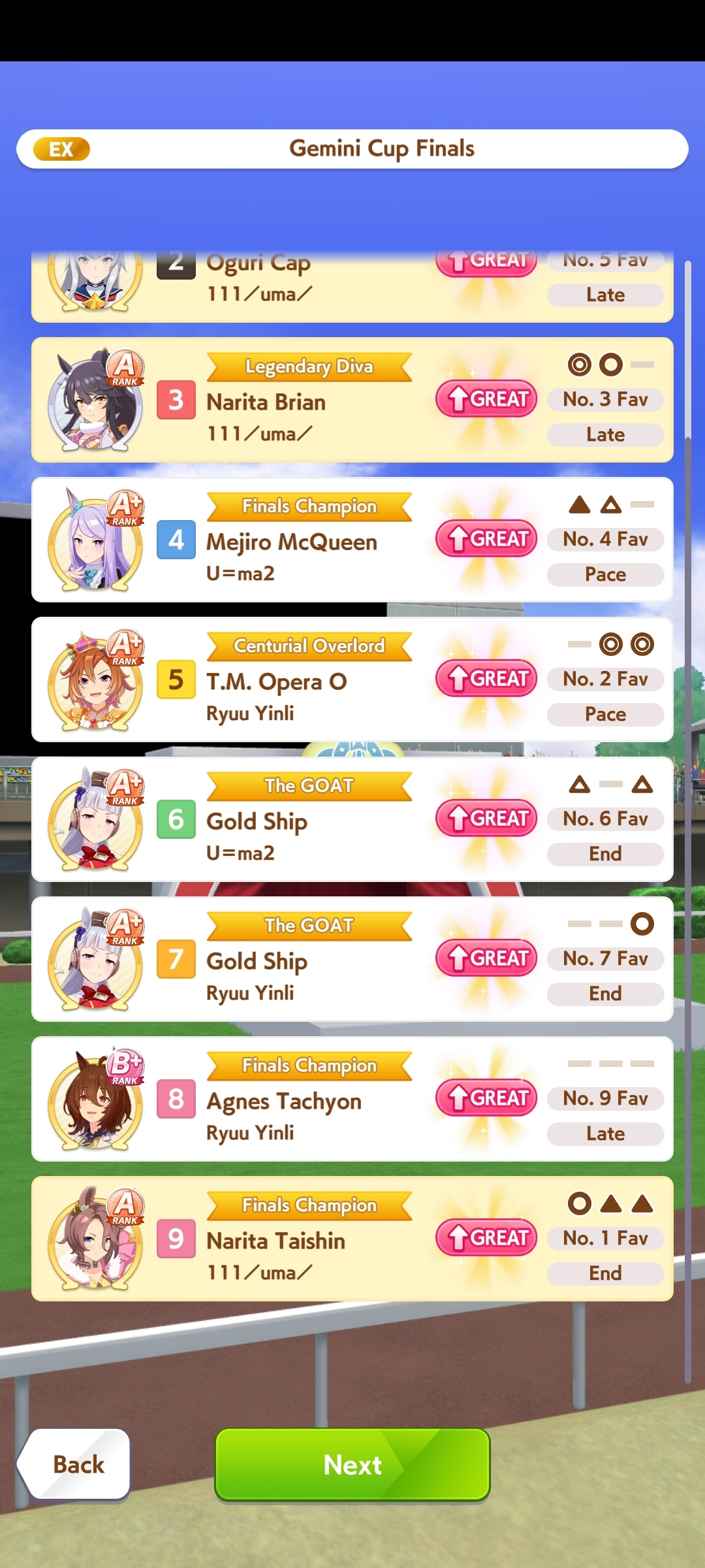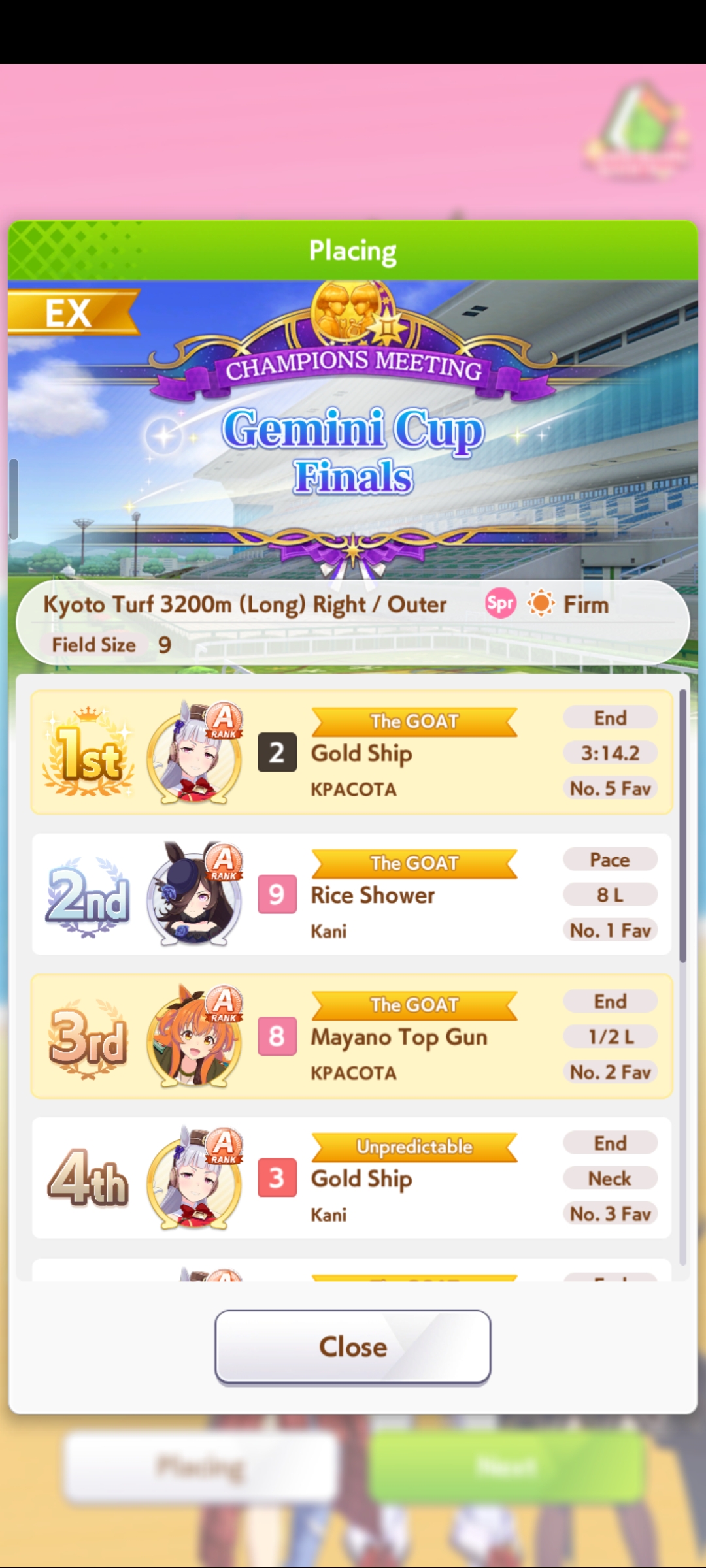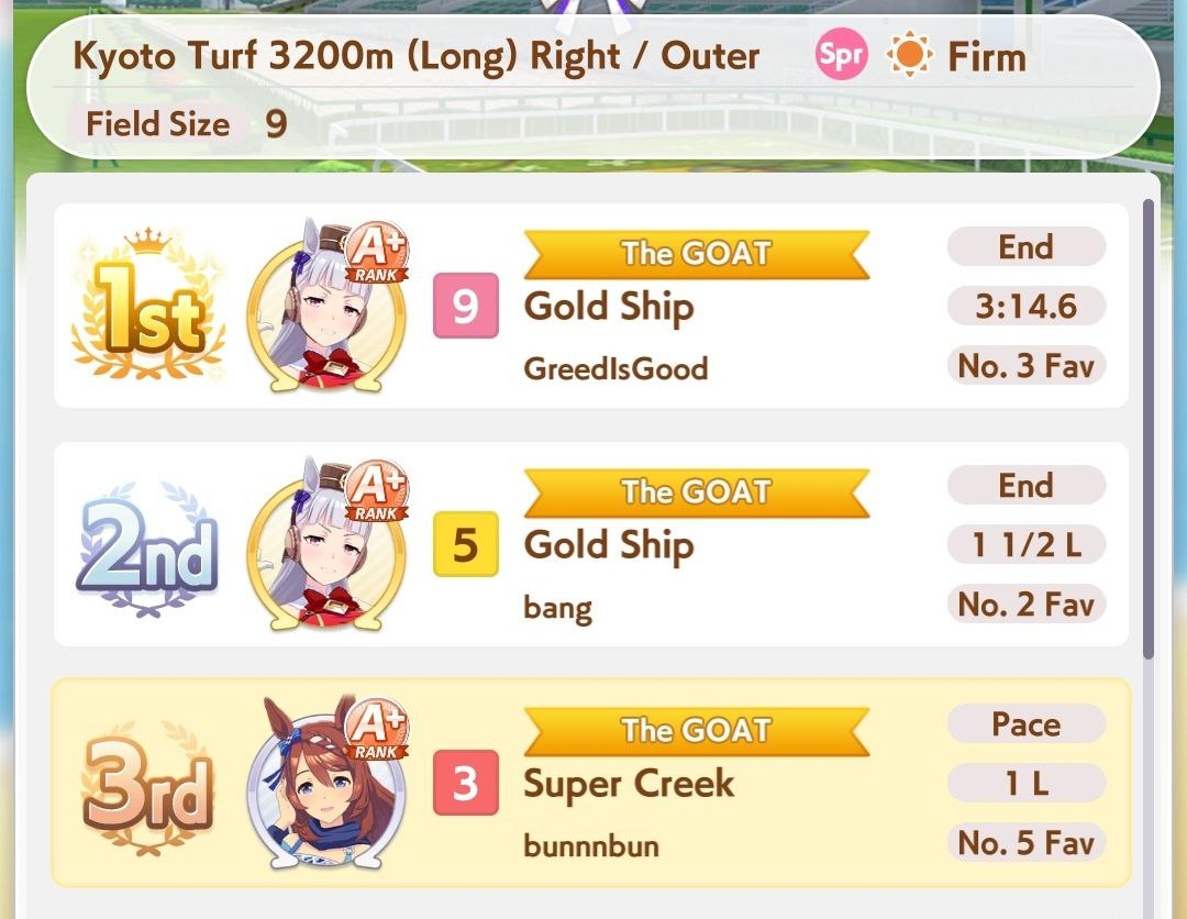 Проорал. Весь турик страдал от китовых Голдшипов, что аж в А в этот раз не прошел, закинул на похуй мем тиму Урара, Дайва, Голд в финал - в забеге сразу две китовые Голдшип...и они друг друга заблочили, а вторая потом не смогла выбежать из пачки пейсеров. В итоге первой приехала моя Голдшип...просто ебанное казино.