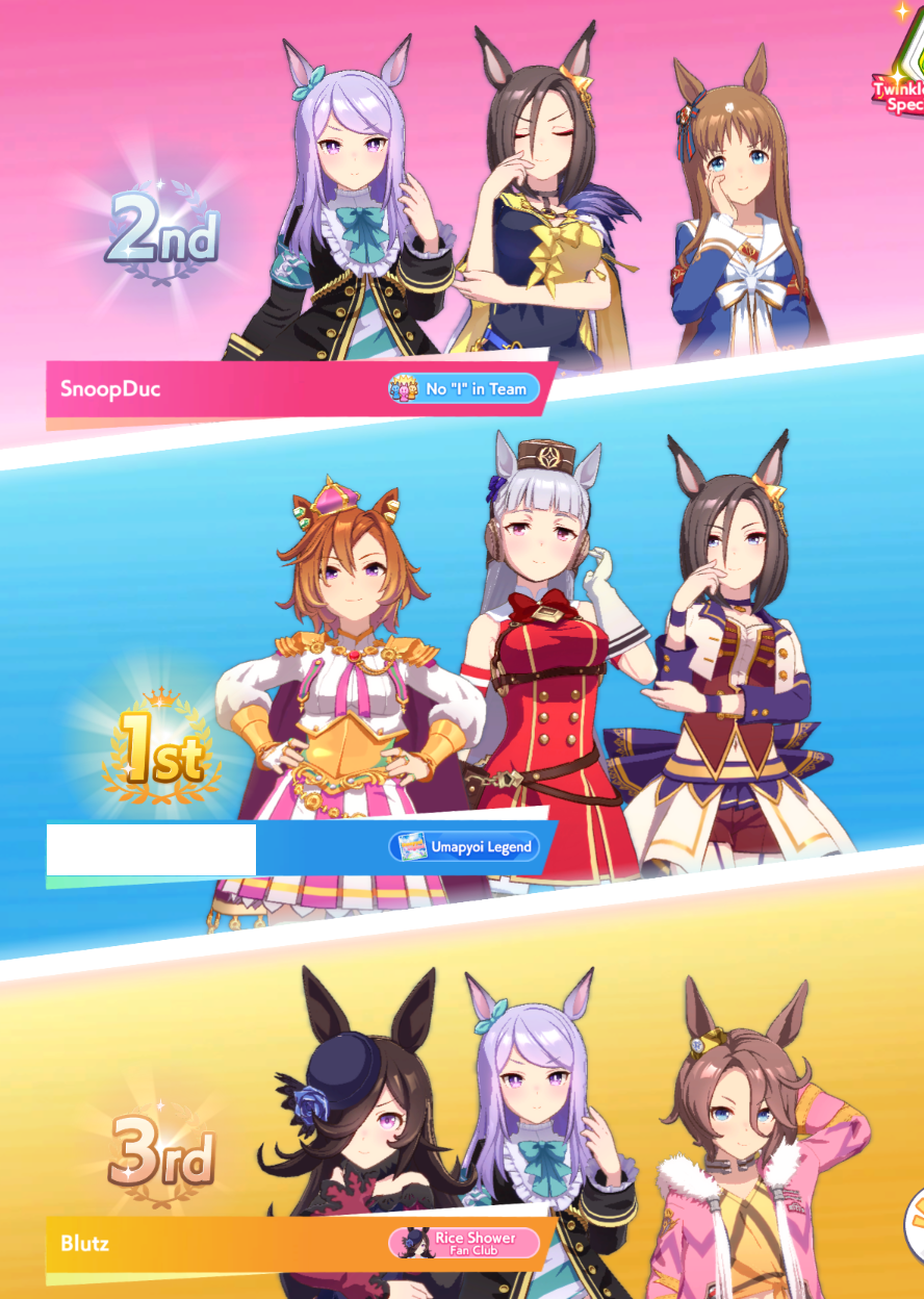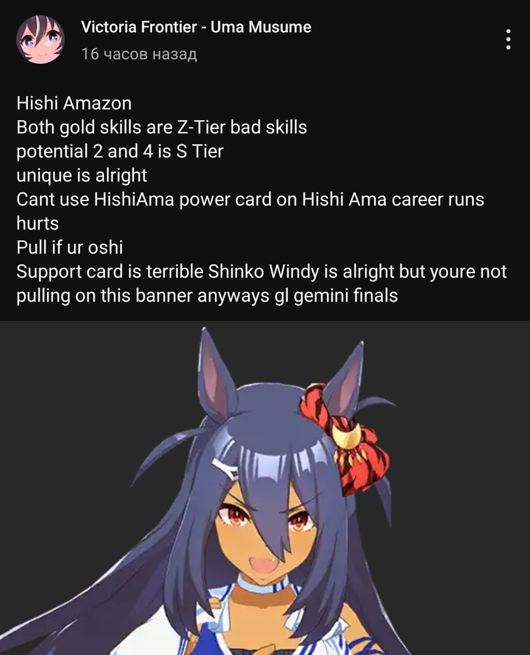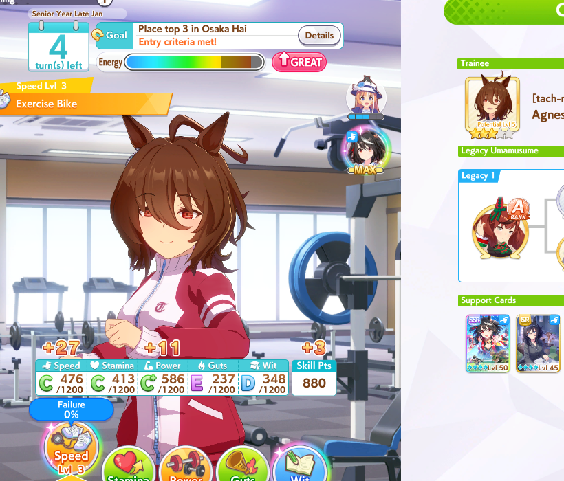 >>5572234 Совершенно об обратном думаю. 2 дня качаю, уже 3 есть с 2стар синих статами (правда спд, павер) и уже 2 раза ловил 3 стар миля. Но это везение. Сами раны не Голд Шип, но вполне себе она бегает. У тебя либо дэка не очень, либо ты качаешь её не правильно. Всегда есть шанс проебать гонку, так как ты лэйт сурджер, но тебе и не надо всё выигрывать, вторых-третьих мест достаточно. Самое главное - взять родителя в фулл стамину и с большим количеством Миля статов. Ты вообще не хочешь брать карты на стамину, прирост стамины у тебя с радужек павер тренировок. Бери 2 павер карты. Мне повезло. У меня МЛБ Амазон и 3 анкап Гелиос. Очень легко точится, каждый ран эти два дня с 600+ стамины. Я бы уже остановился, повторюсь, мне уже выпала 2павер 3 миля, но нужно сраные баннеры фармить для пот 5.