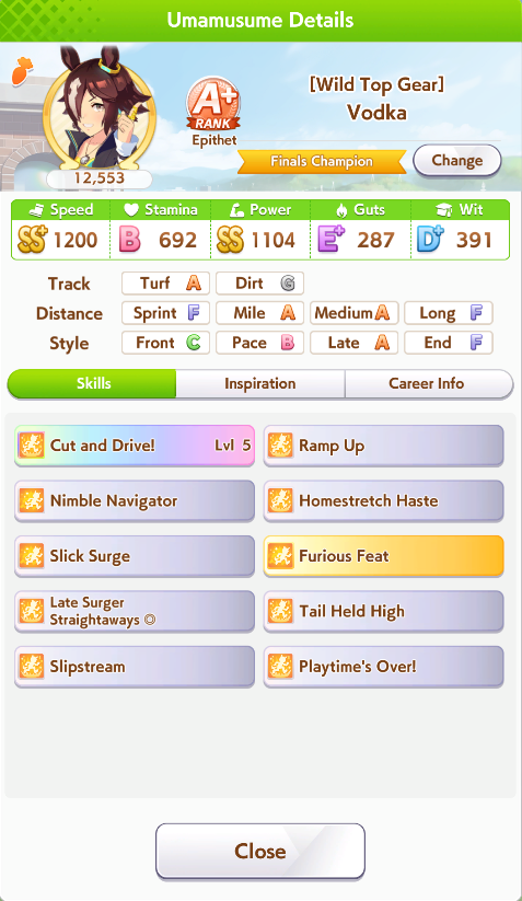 >>5645641 Да. Еще фокус при условии не-лейт старта тоже мгновенно срабатывет. В целом, если у тебя своя Китасан можешь арендовать Огурца для того скилла. Статы у тебя вполне неплохие для того, чтобы в финал А залететь, но под них нужно нароллить более подходящие для кубка скиллы. В качестве гостевого родителя под лейт-энд раннеров желательно брать Райан или Марузенски, так как все турниры не про максималку, а про ускорение.