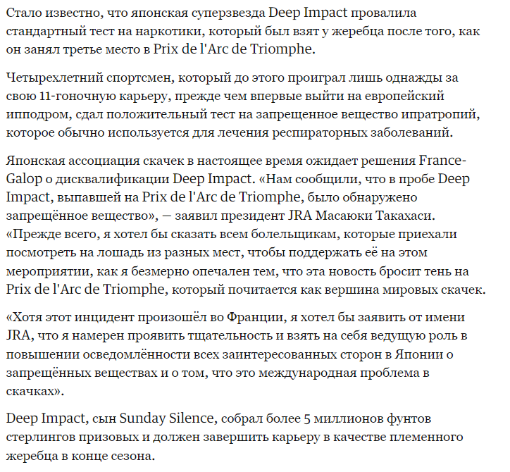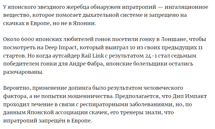 Там это, восьмилетний жеребец, внучек Грасс Вандера, выиграл свою первую гонку за 127 стартов. Понятно что в скачках чего только не бывает, но показалось достаточно примечательным что бы упомянуть об этом здесь. https://www.youtube.com/watch?v=-pgoqmLeGaI