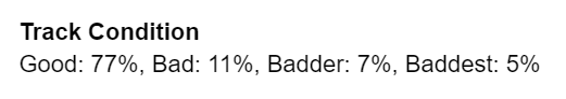 >>5650892 > но конкретно про грунт ни слова А что ты хочешь узнать про грунт? Типы покрытия там бывают 芝 (трава) и ダート (dirt). Состояние бывает 良 (хорошо), 稍重 (слегка тяжело), 重 (тяжело) и 不良 (хуёво). Погода бывает 晴れ (ясно), 曇り (облачно), 雨 (дождь) и 雪 (снег).