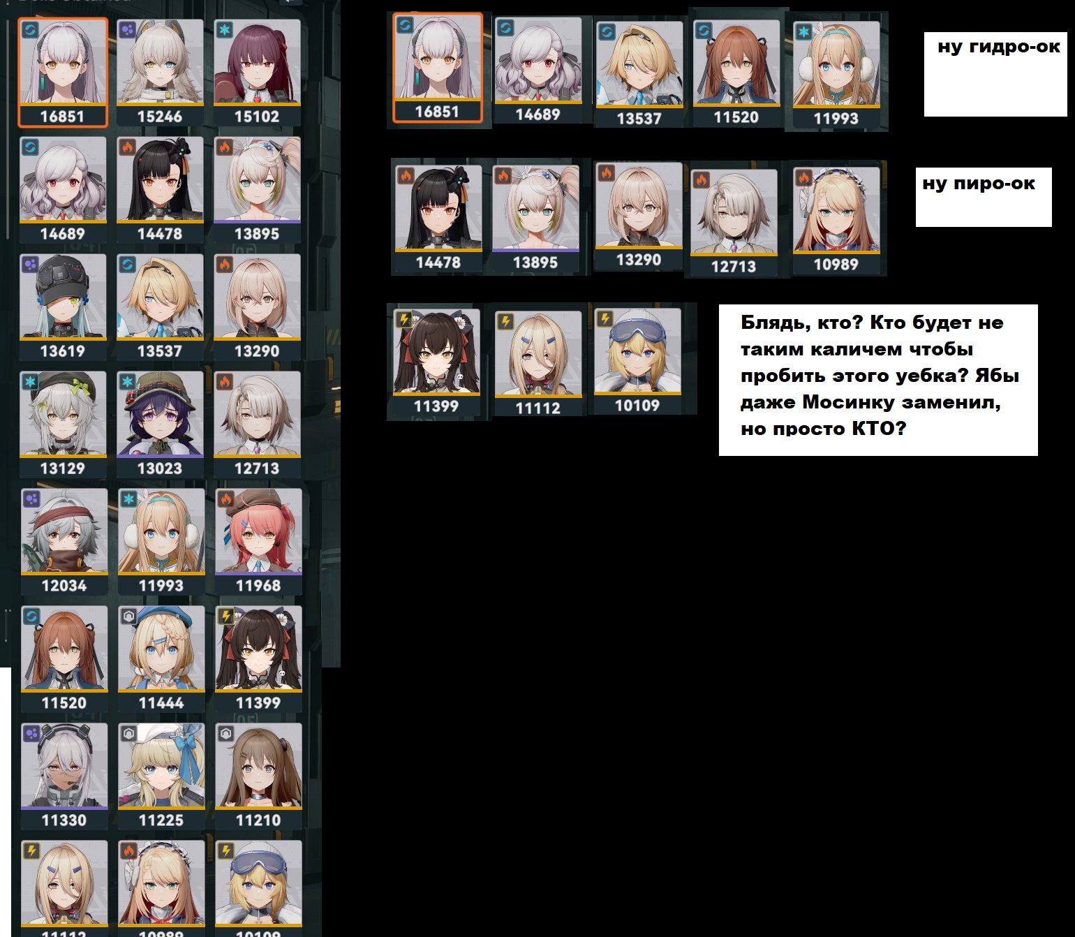 >>5638618 Качай всех золотых кукол кроме кошки, пока что. Кошка без Клюкай не работает. Можешь у друзей или у платуна одолжить Клюкай и посмотреть как они вместе работают, но без этой синергии Кошка это бесполезный кусок. Из фиолетовых: Наган, Литтара, Гроза, Кролик это мусор, который давно пора в утиль. Колфне, Читу и Ксюху советую апнуть до 40 максимум, потом уровни много ресурсов требуют и эти куклы-саппорты дальнейших вложений не стоят. Немесис нужна исключительно, чтобы накладывать дебафф на защиту. Против боссов выше тебя уровнем может иногда помогать. Шаркри — лучшая фиолка, на которой держится вся пиро пачка. Качать + одевать.