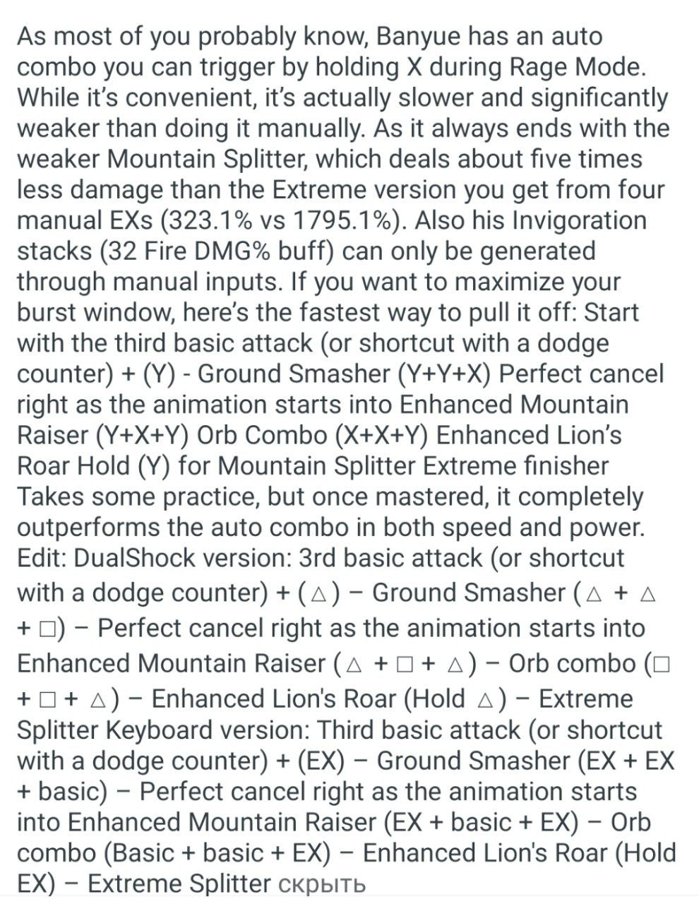 >>5737472 1. Забей на всякие взаимодействия стихий, если ты раньше играл в геншин. Их тут по сути нет и/или они ничего не значат. Если слышишь объяснения - скипай. 2. Почти у каждого персонажа свои тонкости которые ссут на устоявшиеся принципы или привычное поведение механик. Поэтому просто затрачивай ротации конкретных пачек с ним. Это нормально и путь к успеху. 3. У некоторых мобов разные окна для парирования - где в начале желтой вспышки, где-то до, где-то после, где-то вообще похуй насколько широкое это окно. Так что тут тоже к каждому применяться надо. Так что если будет кто-то про это что-то объяснять, можешь скипать. 4. Некоторые боссы особенно в Дедли Ассолте имеют свои требования того что б их как следует взъебать, например жертва Брингера буквально сигнатурный босс мияби и остальные заметно сосут на нём. 5. Дырка вообще отдельный мир, просто садишься и кайфуешь в свободное время, объяснять слишком заёбно что к чему там, но всегда можешь перезапустить если что не так пошло, так что ничего не теряешь. Такая игра, ничего не поделать. Для нуфага слишком дохуя всего задрачиввать, особенно после того как его заставили говно жрать в телевизорах первую часть игры, а потом эту механику нахуй выбросили. 6. Ульта. Да, теперь у каждого своя, поверить не могу что когда-то у нас было такое говнище как 1 ульта на всех. Но тем не менее в выключенного противника всё равно в основном 1 персонаж сдаёт ульту, если это не Астра или два ДД в отряде. Кое что в системе быстрой помощи поменяли, а так вроде ничего больше.