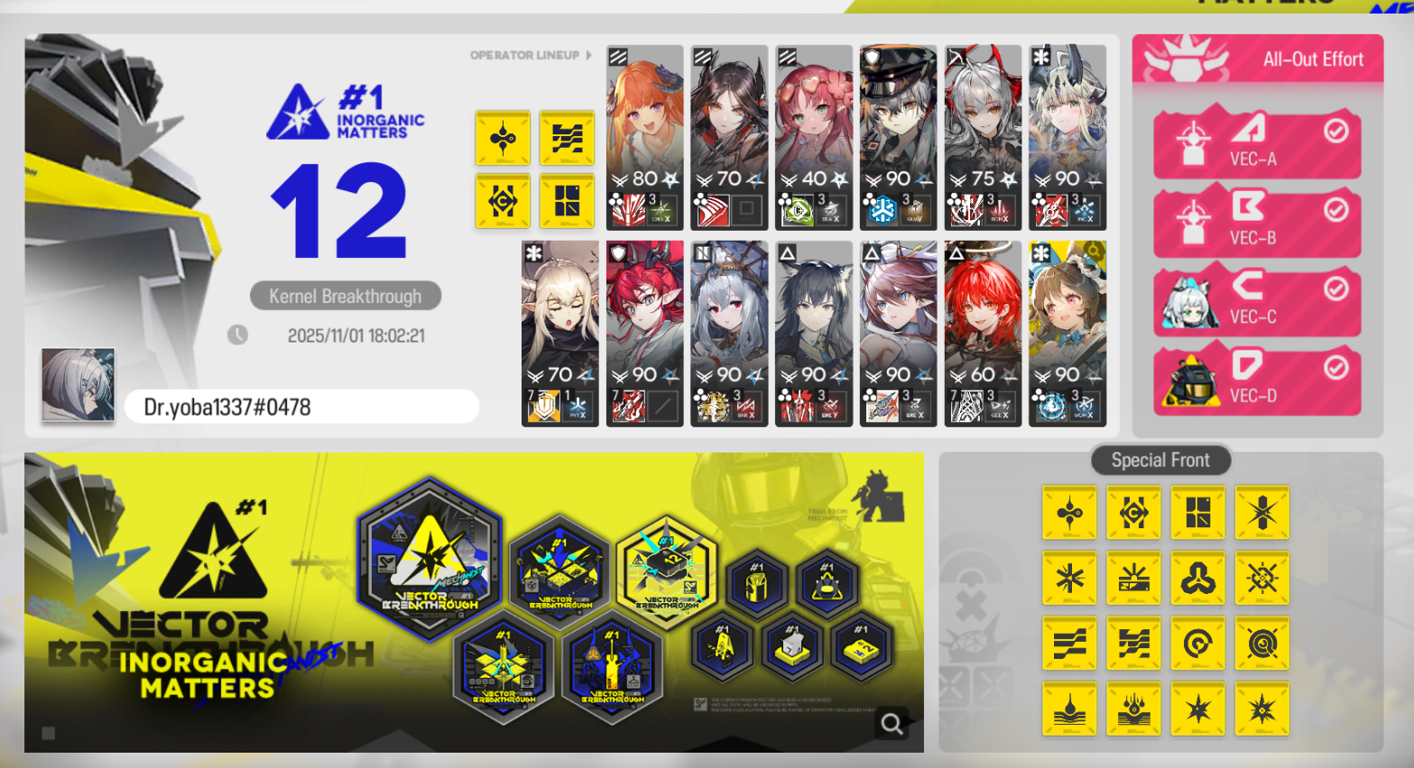 Открыт ивент Vector Breakthrough #1 Inorganic Matters. Vector Breakthrough #1 Inorganic Matters начался 30 октября и продлится до 20 ноября, участвуйте в сложных боях с элитным оперативником Механистом и получайте разные награды! Также в ивенте присутствуют свои бафы, для получения которых надо проходить отдельные карты и оставлять там операторов, с которыми и прошли, в гарнизонах. Операторы из гарнизонов недоступны в линейке боёв, только если их заменить другими.