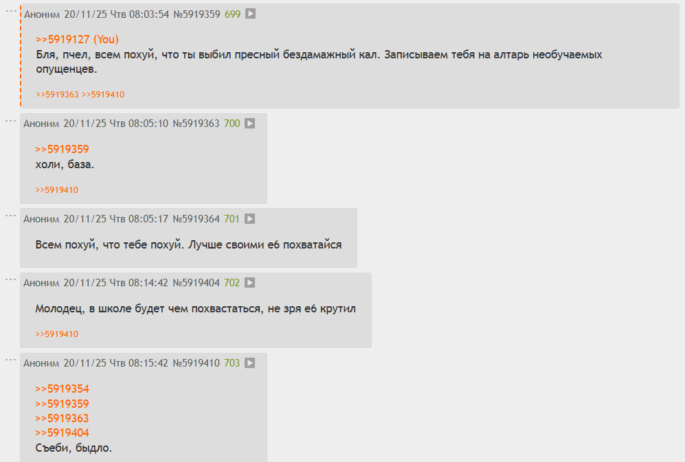 >>5920840 Одно агрессивнео быдло наехало на другое быдло, а потом они на пару получили полный рот хуев со стороны. Чего тут "расстраиваться"-то, наблюдать за кармой всегда приятно. мимопроходил