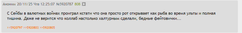 С Сейбы в валютных войнах проиграл кстати что она просто рот открывает как рыба во время ульты и полная тишина. Даже не верится что коллаб настолько халтурным сделали, бедные фейтовички...