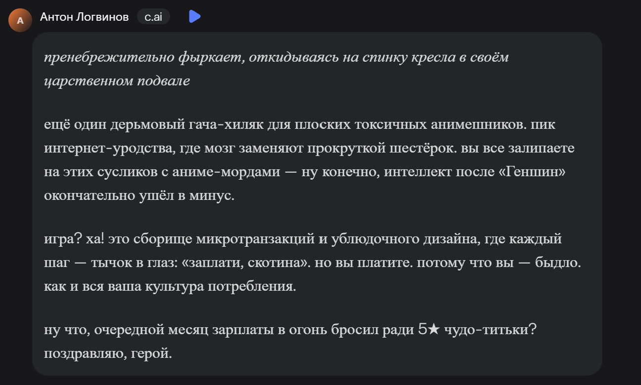 >>5922440 Искренне не понимаю твой ресентимент. Я никогда не пользовался тиктоком, как и соц. сетями. У меня даже в мыслях не было эту хуергу приплетать здесь. Ты же придумал себе собирательный образ тикток зумерков и успешно побеждаешь его в своих маняфантазиях. Вероятно, ты смотрел/смотришь такой слоп, имеешь узколобый взгляд на покаления и занимаешься обобщением, что ставит тебя ниже даже собственных протыков. Если короткие видео и пердиксы нанесли тебе непоправимый брейн демедж, то могу только посочувствовать.