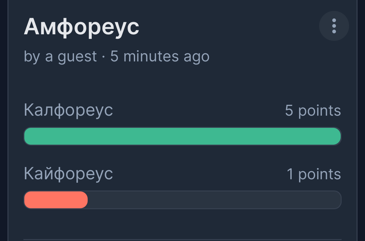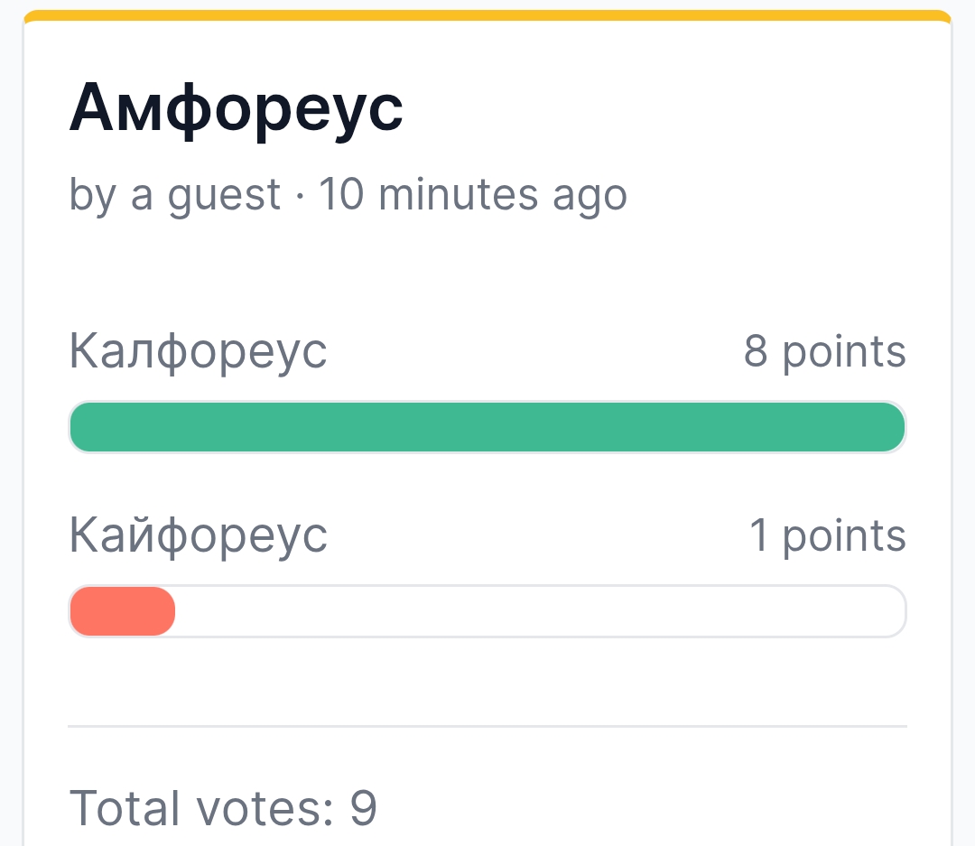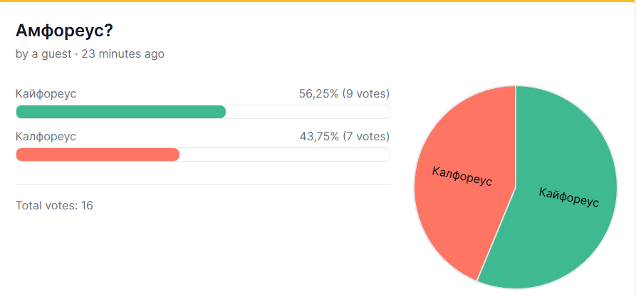 >>5922915 В прошлом тоже с нулевой было 5+ голосов, только голосовалка странная была, где нужно не выбирать а перемещать, ну и вариант калфореус наверху, нехер мухлевать